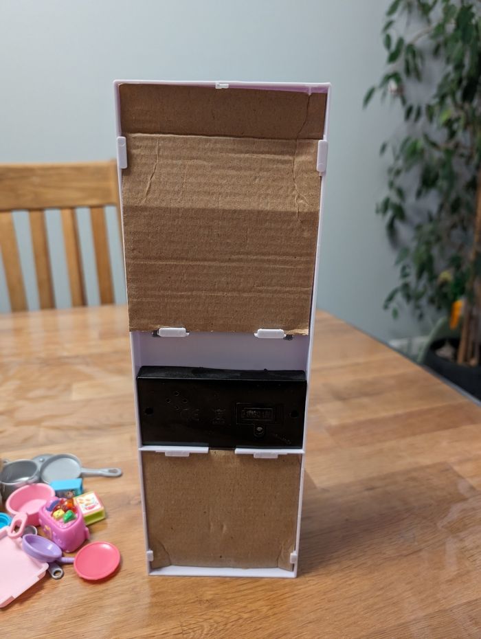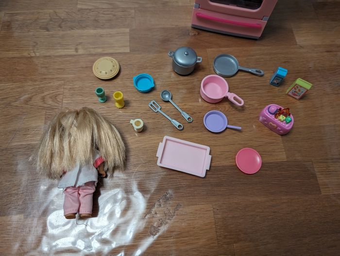 Élément de cuisine pour poupée 30 cm avec petite cuisinière Bon état, carton légèrement abîmé en haut, quelques traces, avec tout ce qui est présent sur les photos.