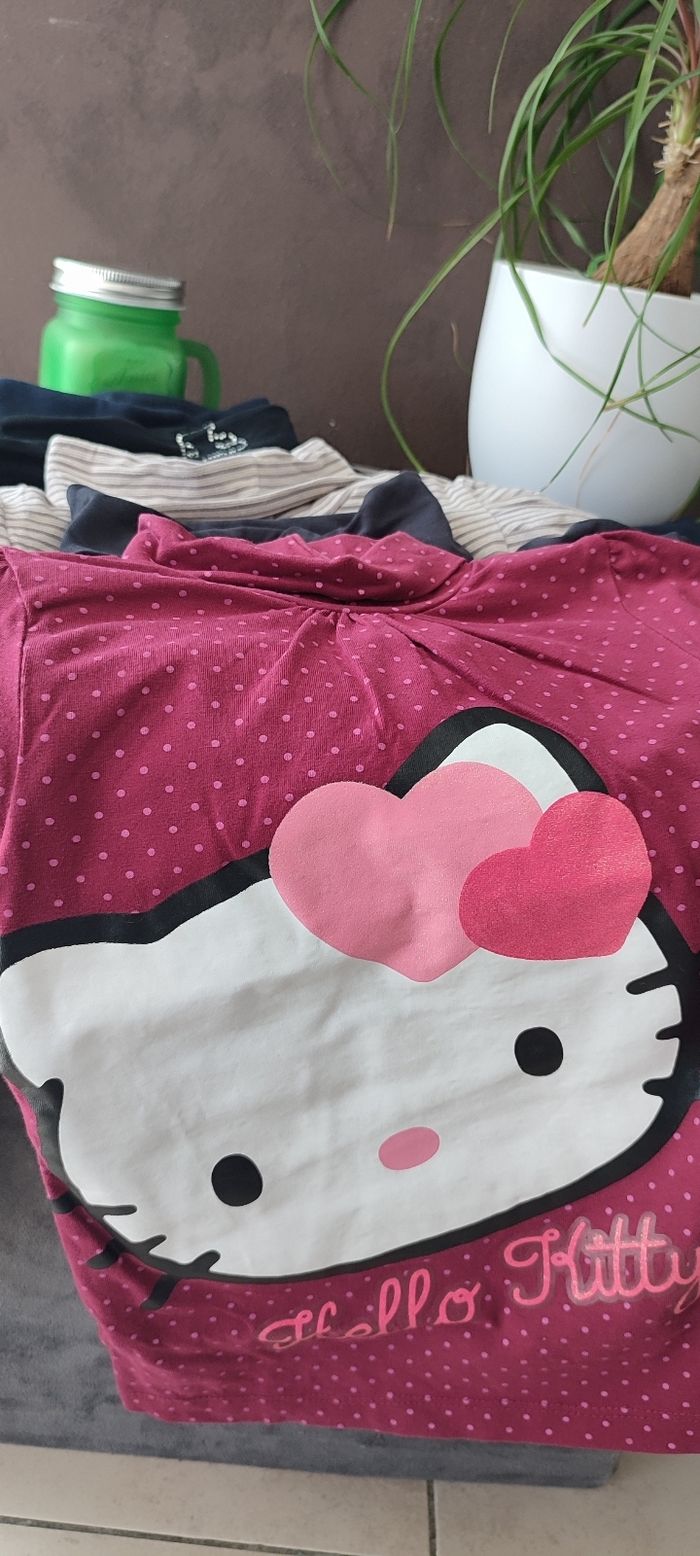 Tee-shirt Hello Kitty Bordeaux à pois rose paillettes dans les cœurs dessin épais Noirs 5 ans NKY fronces au col et Lulu Castagnette avec nounours strass au col Beige marron avec fil doré manches ballon grand 4 ans tape à l'oeil Tee-shirt marine neuf sans étiquette Palomino Maison non fumeur sans animaux