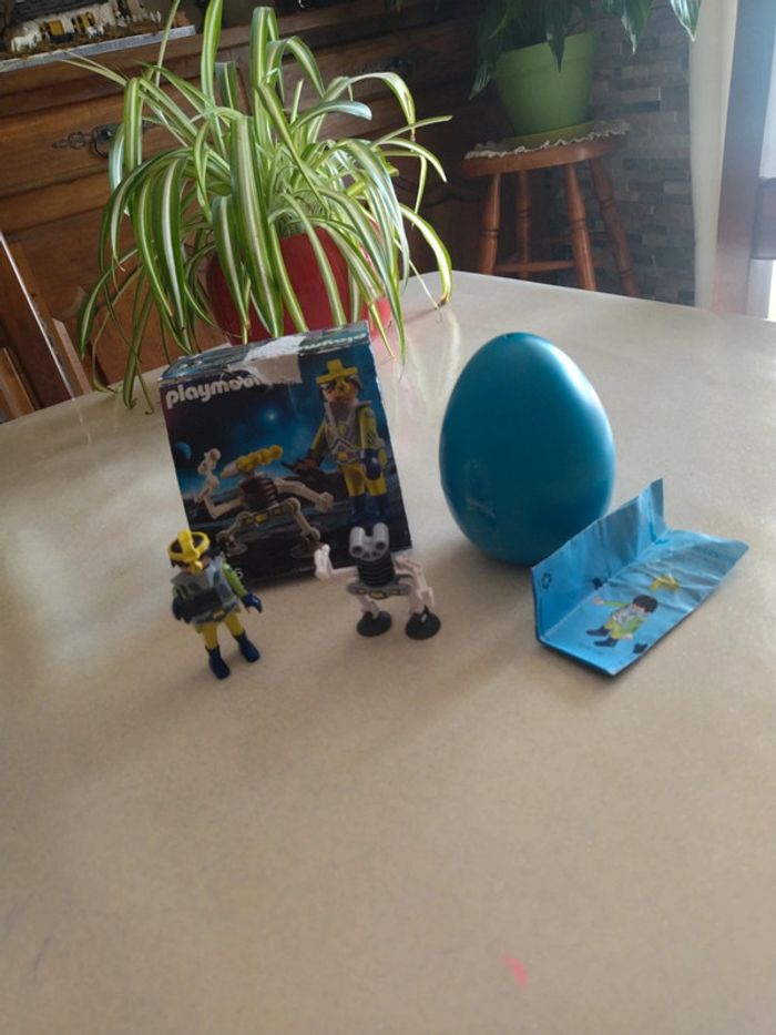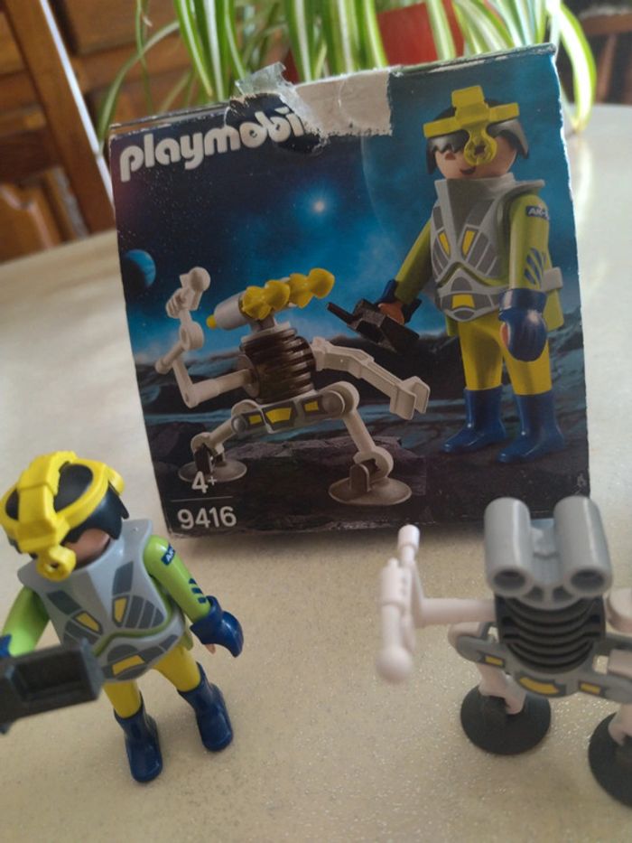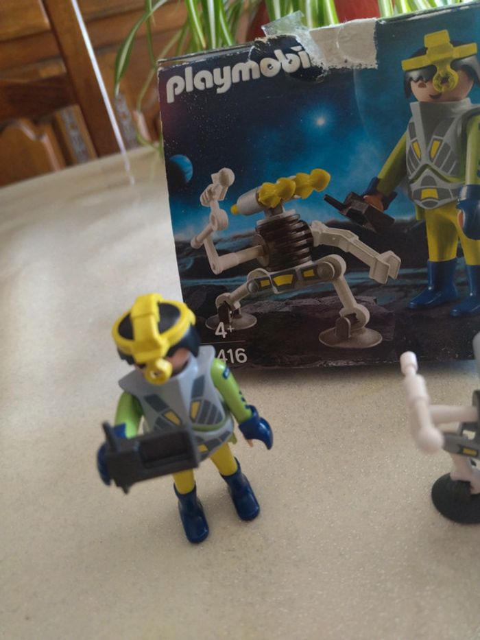 Agent de l'espace avec son robot playmobil. Très bon état. Il manque les deux lances jaune. Age 4+