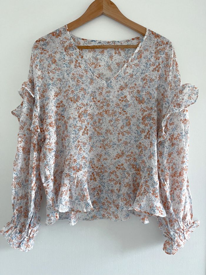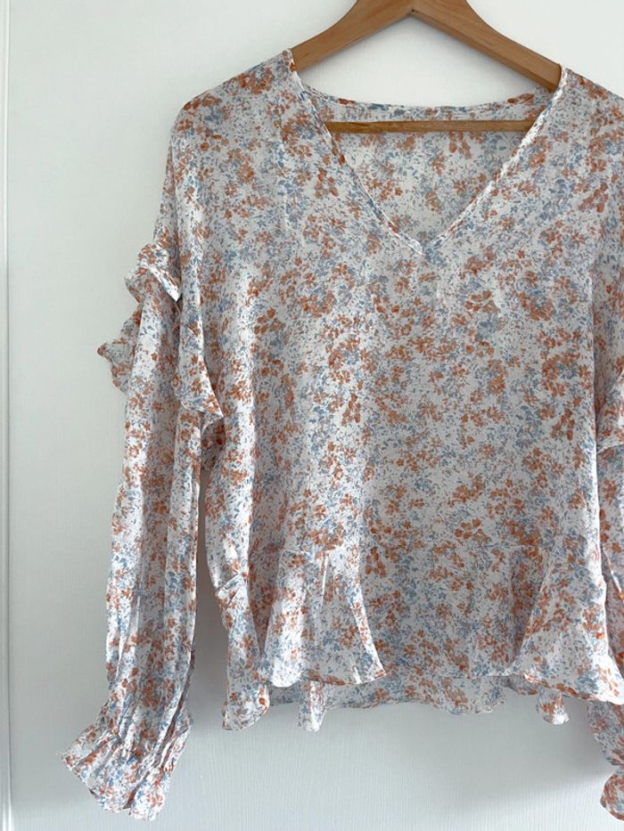 Blouse à volant blanche, orangé et bleu clair - photo numéro 1