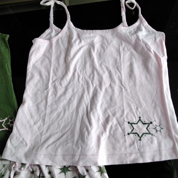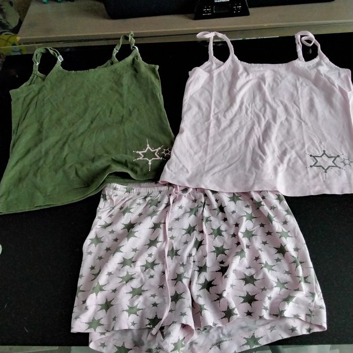 Ensemble composé de 2 caracos et d’un short de uit taille 38/40 de marque INCONNU 1 caraco kaki et 1 rose Short rose avec des étoiles kaki taille élastique avec cordon 100% coton #lamadelon_femme_38