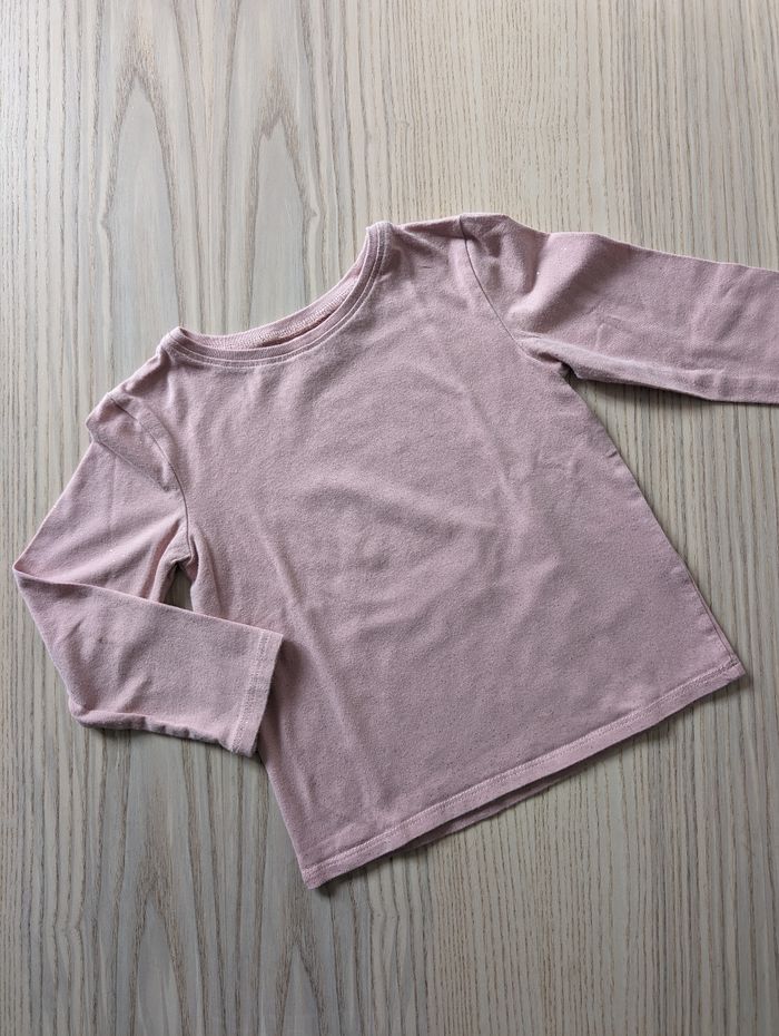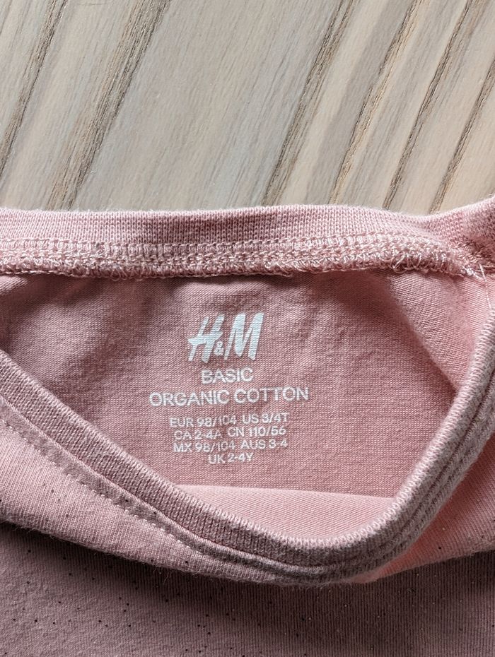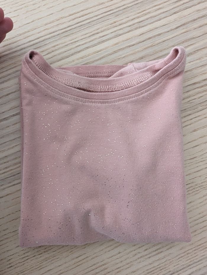 T-shirt manches longues. Rose avec plein de petites paillettes dorées Marque H&M Taille 98cm/104cm Déjà porté, petite tâche sur la manche et sur le devant comme sur les dernières photos. État satisfaisant #tennyteb36mois #tennyteb3ans #tennyteb4ans