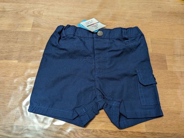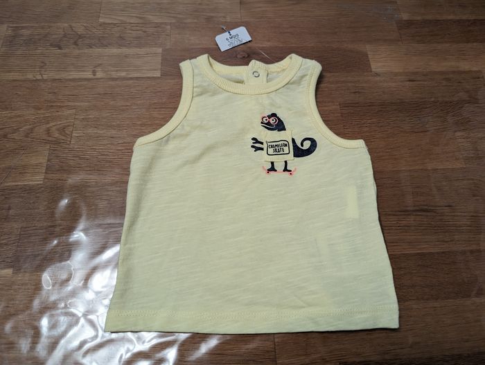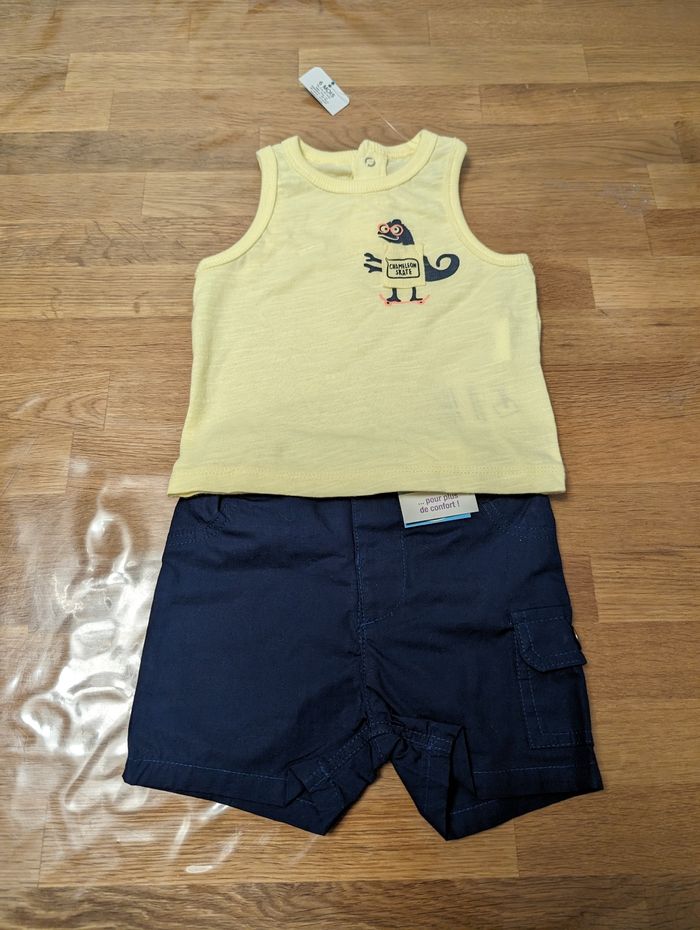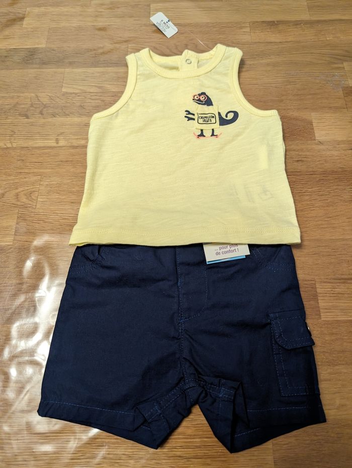 Ensemble garçon 6 mois Bébé rêve Neuf avec étiquette Short bleu marine, ceinture ajustable T-shirt sans manches jaune 100% coton
