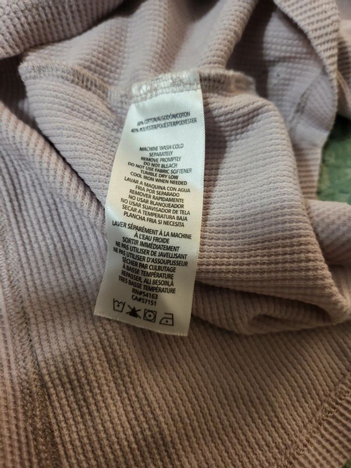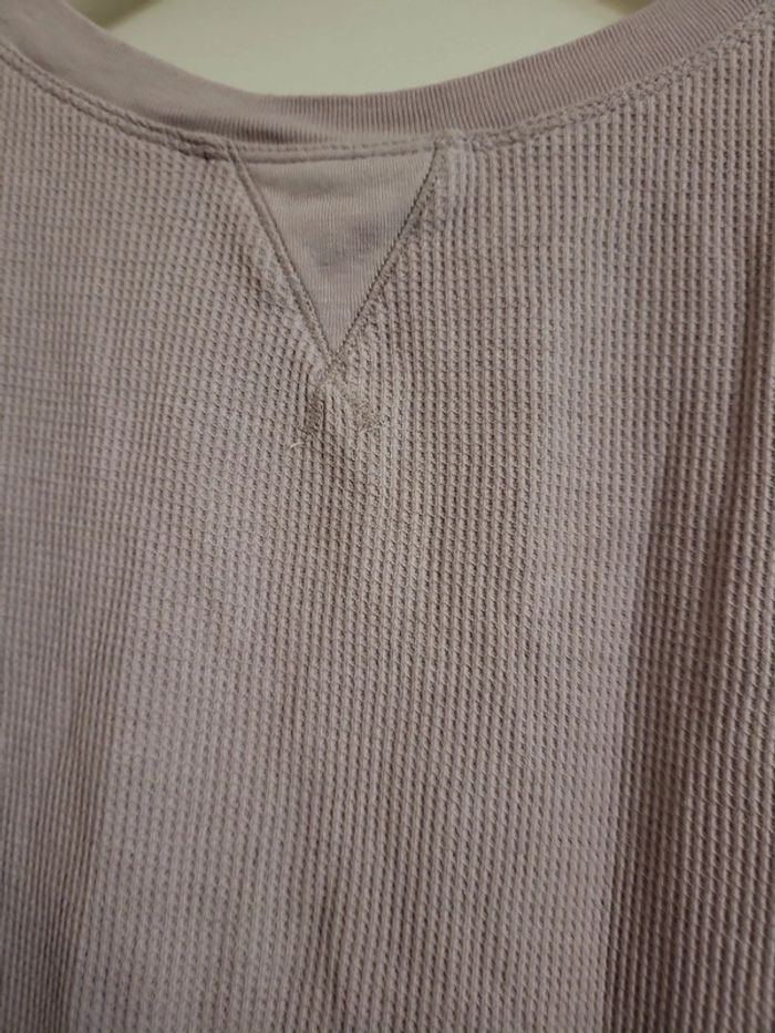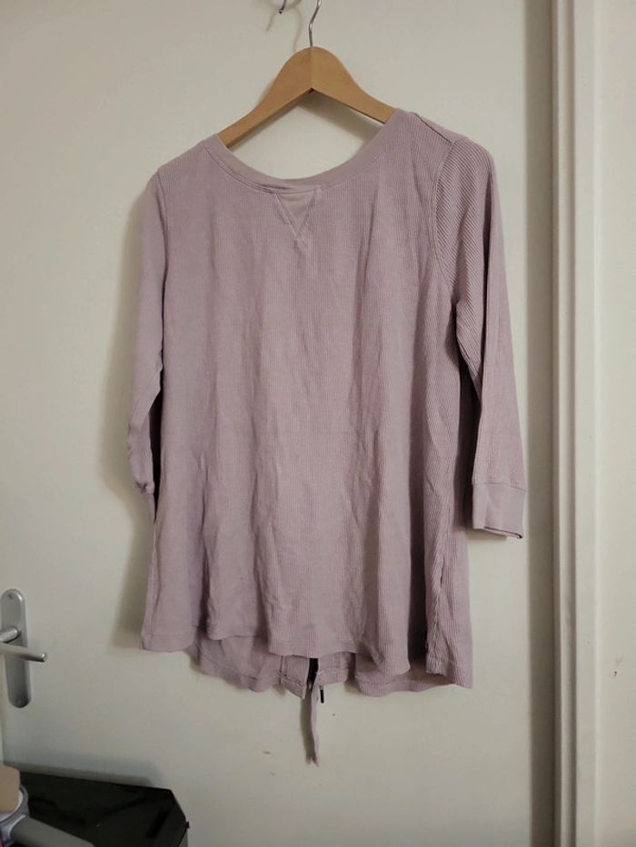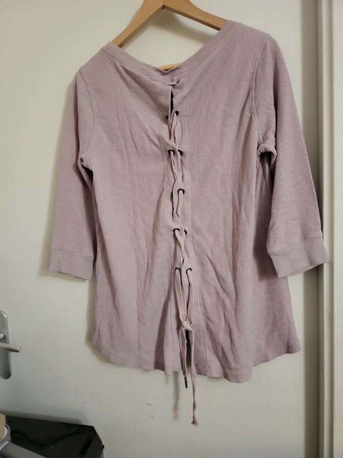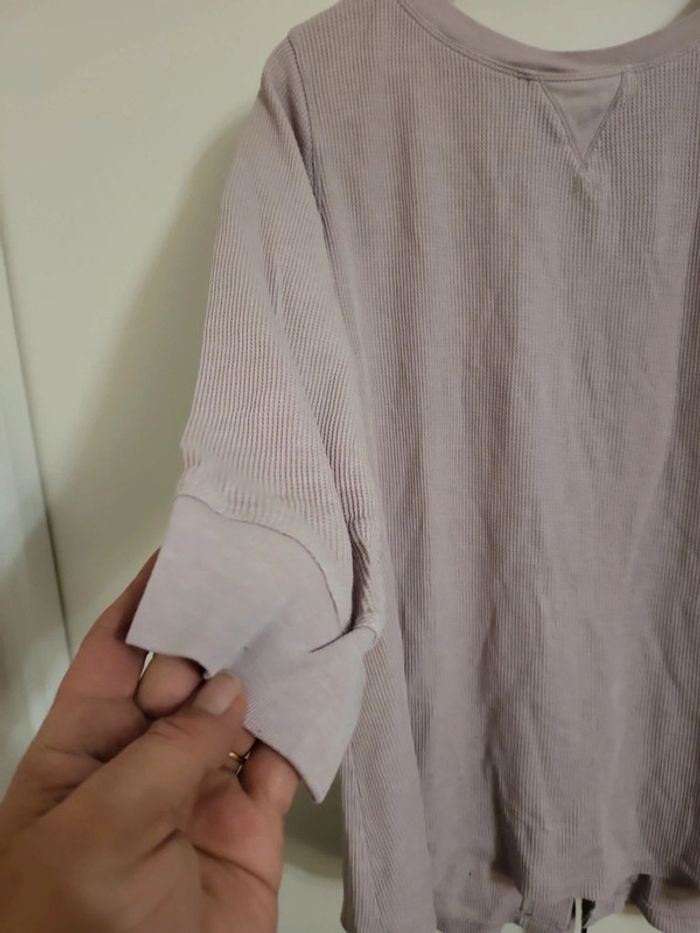 Haut lilas/gris Manches 3/4 Matière légère et confortable façon nid d abeille , coton et polyester Dos original à lacet Calvin Klein Sans étiquette raille, environ L à XL S4