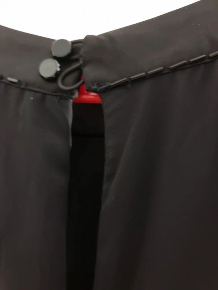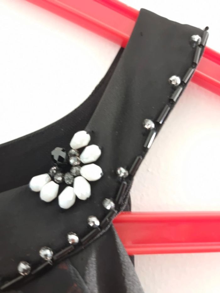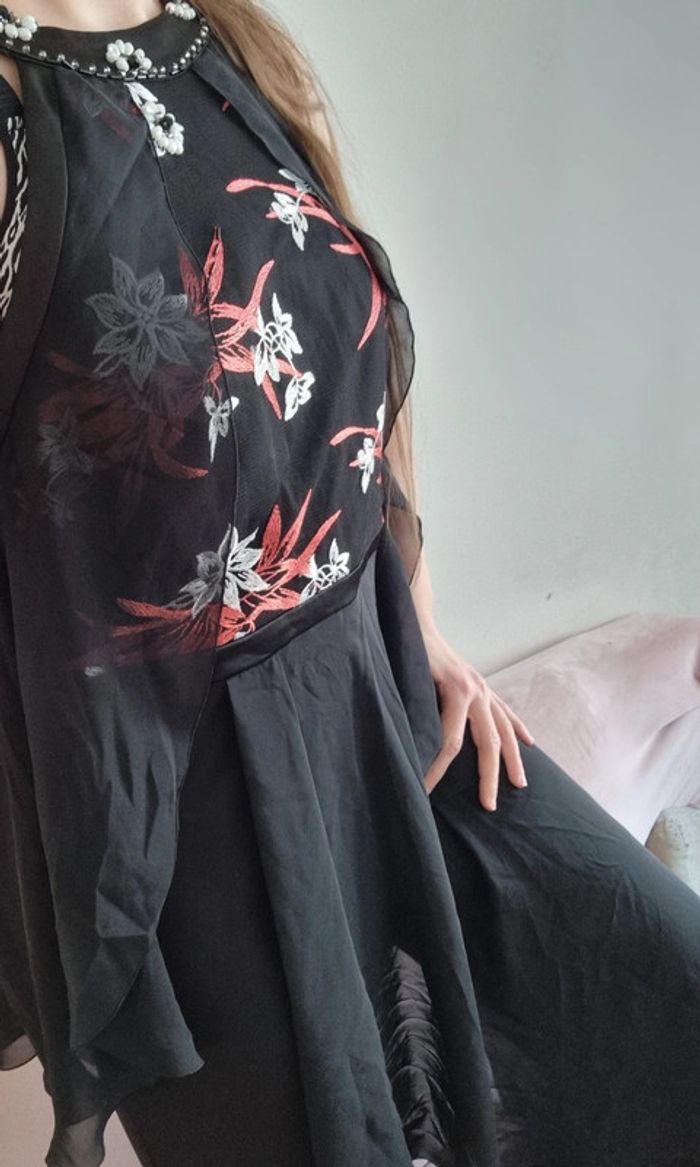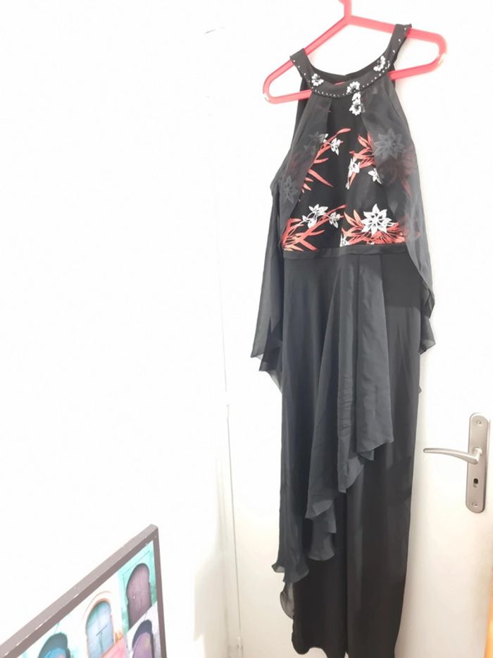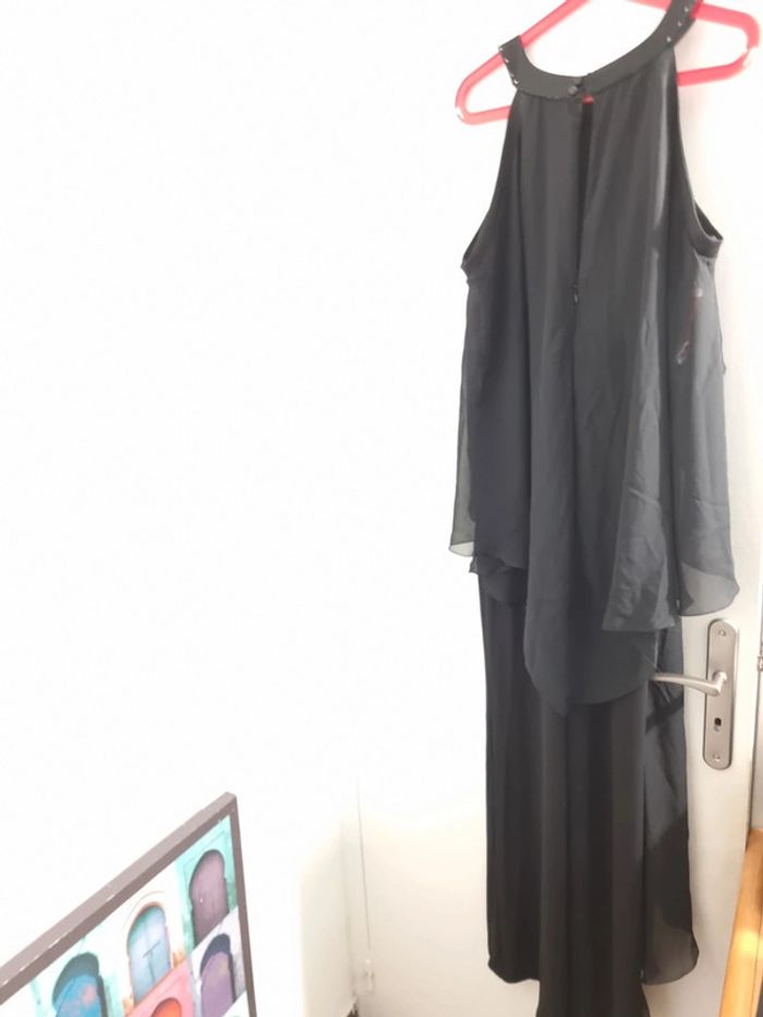 Combinaison pantalon noire avec broderies et perles Paola Forti, créations de marque italienne pour mariages et cérémonies. Portée une seule fois pour un mariage. Combinaison élégante et raffinée Voiles noirs sur le col divisé et ouvert en deux sur la poitrine, pour laisser apparaître les motifs de branches rouges et feuilles blanches brodées Voiles asymétriques sur la partie pantalon. Toit cela donne beaucoup de légèreté et une très belle finition à cet ensemble. Présence de perles sur le col et le haut de la poitrine pour faire apparaître des motifs géométriques et floraux Deux boutons sur le haut du cou pour attacher à l'arrière. Puis on milieu de dos une fermeture. Sur la partie haute du dos on aura un très discret dos nu, tout en élégance. La taille italienne est un 50, Correspond à un 46 48 taille française, pour moi cela correspondait au moment où je portais du 46. N'hésitez pas à vérifier avec vos mensurations. Mesures : 54 cm Largeur sous aisselles 45 cm Largeur à la taille 153 cm Longueur totale Pour information prix neuf était d'environ 160 euros. Très bon état, car portée quelques heures uniquement, pour un mariage. #angel_vêtement_adulte_46 #angel_vêtement_adulte_48