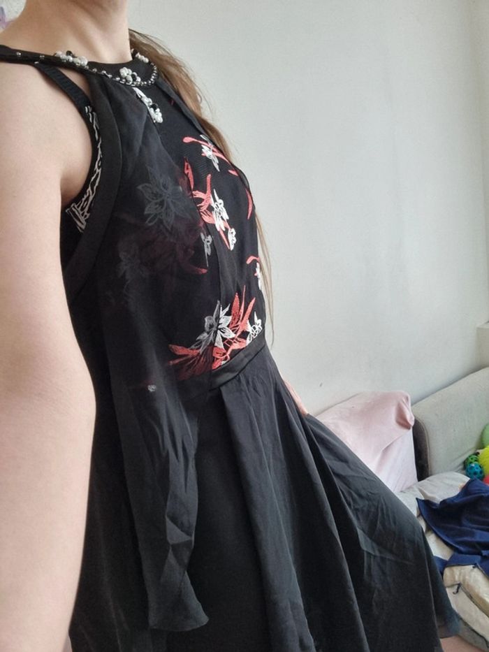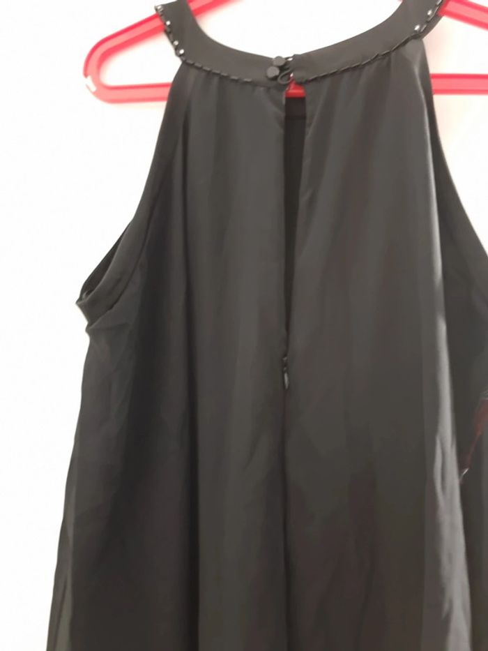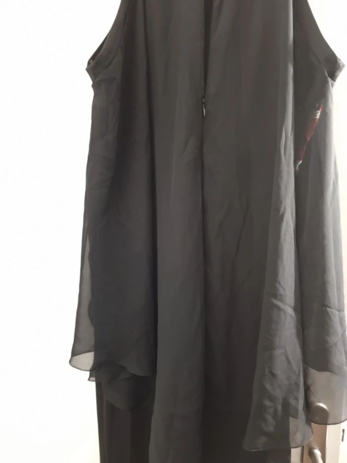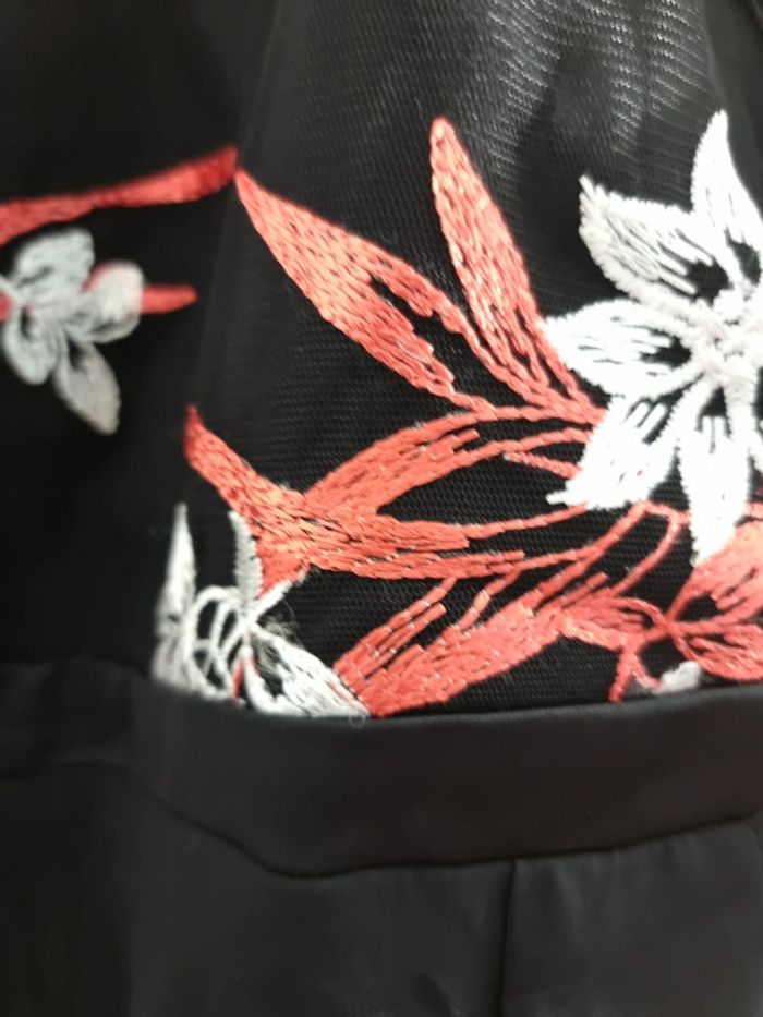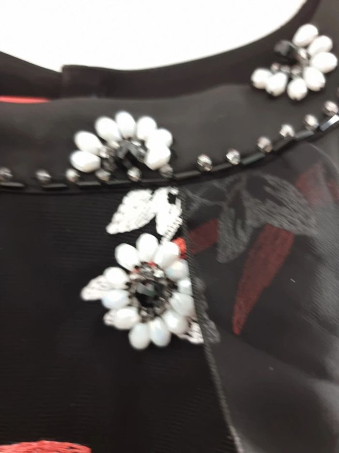 Combinaison pantalon noire avec broderies et perles Paola Forti, créations de marque italienne pour mariages et cérémonies. Portée une seule fois pour un mariage. Combinaison élégante et raffinée Voiles noirs sur le col divisé et ouvert en deux sur la poitrine, pour laisser apparaître les motifs de branches rouges et feuilles blanches brodées Voiles asymétriques sur la partie pantalon. Toit cela donne beaucoup de légèreté et une très belle finition à cet ensemble. Présence de perles sur le col et le haut de la poitrine pour faire apparaître des motifs géométriques et floraux Deux boutons sur le haut du cou pour attacher à l'arrière. Puis on milieu de dos une fermeture. Sur la partie haute du dos on aura un très discret dos nu, tout en élégance. La taille italienne est un 50, Correspond à un 46 48 taille française, pour moi cela correspondait au moment où je portais du 46. N'hésitez pas à vérifier avec vos mensurations. Mesures : 54 cm Largeur sous aisselles 45 cm Largeur à la taille 153 cm Longueur totale Pour information prix neuf était d'environ 160 euros. Très bon état, car portée quelques heures uniquement, pour un mariage. #angel_vêtement_adulte_46 #angel_vêtement_adulte_48