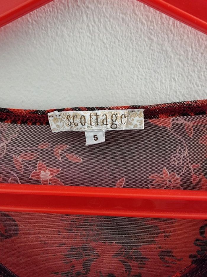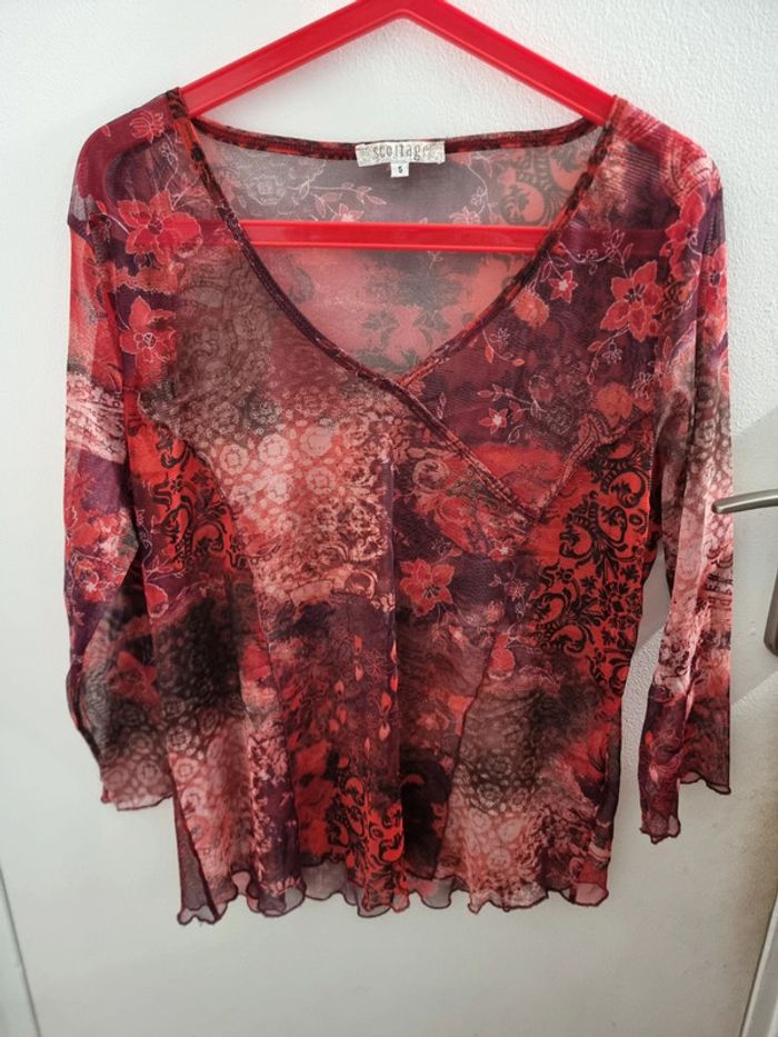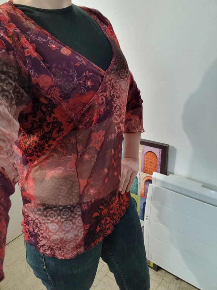 Blouse en mailles fines à motifs fleuris Petit haut fin et léger pour effet haut sexy ou habillé, selon le débardeur, croc top, brassière, soutien gorge utilisé en dessous. Sur la photo il est essayé avec un croc top pour montrer la transparence du tissus (non vendu avec 😉) Blouse en mesh à motifs Modèle avec encolure en V Effet cœur croisé Manches 3/4 Couleur : dégradés de rouge. Taille 5 Tissus très extensible Marque : scottage Dimensions : Largeur sous aisselles 58cm, tissus non étiré Longueur 62 cm Correspond à une taille 50 - 52, n'hésitez pas à vérifier avec vos mensurations. En très bon état. #angel_vêtement_adulte_50 #angel_vêtement_adulte_52