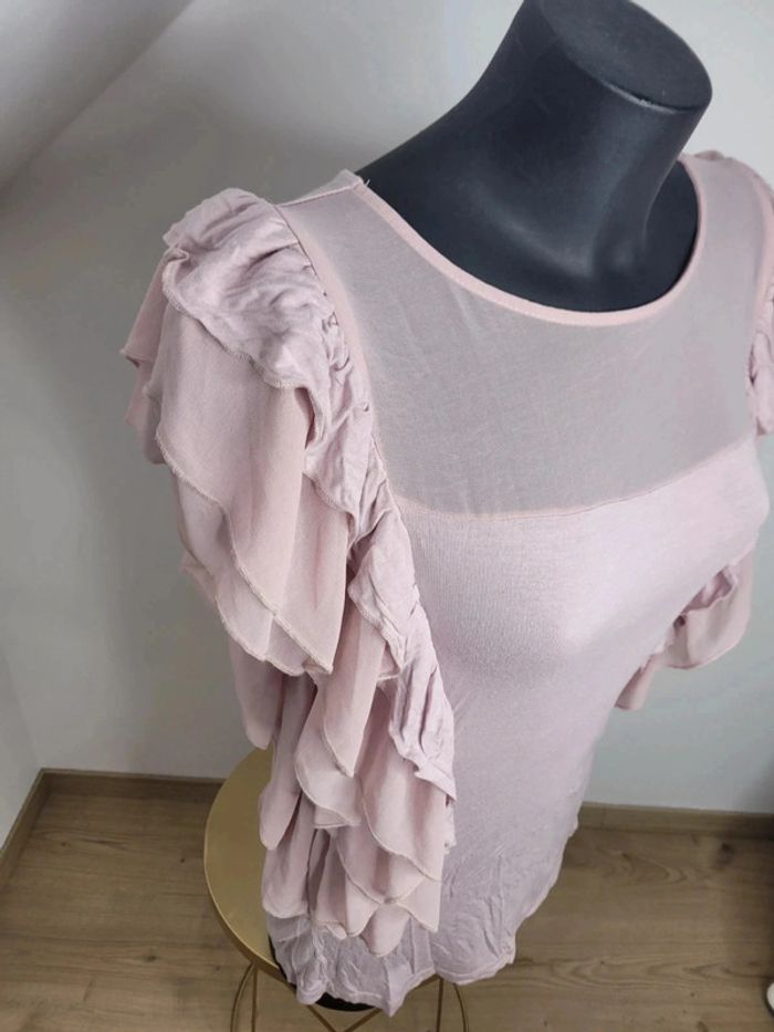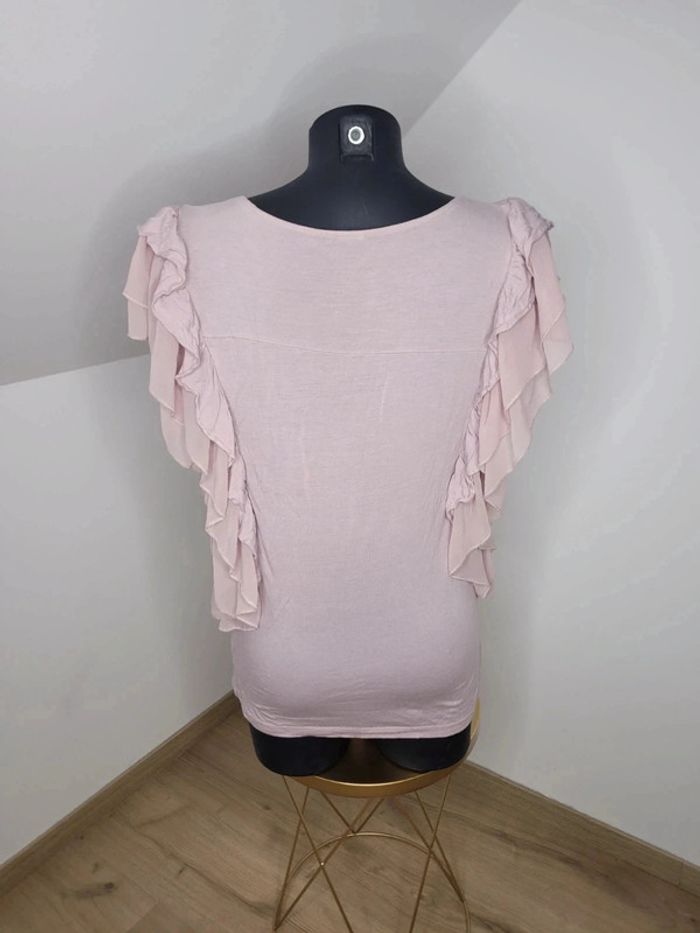 Tee shirt rose à volants sur les côtés Plus d'étiquette mais cela correspond à une taille 36 Petit trou à l'avant (voir dernière photo) N'hésitez pas à créer votre lot, n'hésitez pas à cliquer sur les liens pour voir mes autres annonces : #beautifuldressing36 Remise sur les lots activées !