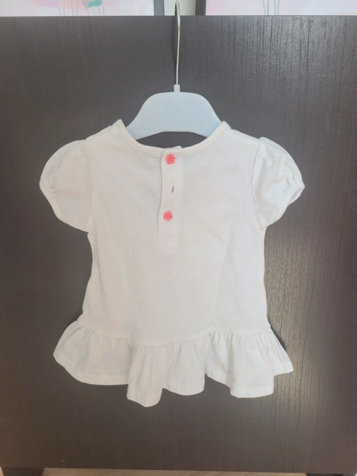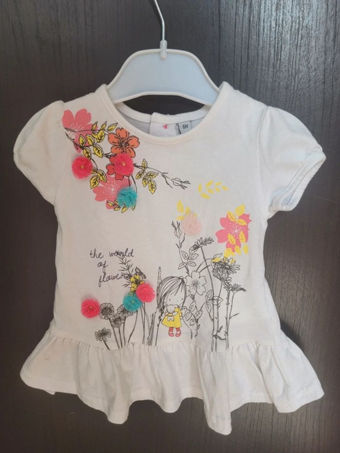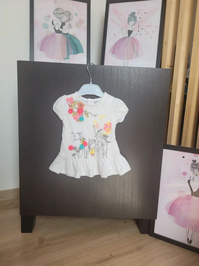 Robe blanche avec motifs fleurs et petite fille et doudou 6 mois 60% coton, 40% polyester N'hésitez pas à créer votre lot, n'hésitez pas à cliquer sur les liens pour voir mes autres annonces : #beautifuldressing6moisf #beautifuldressingenfant