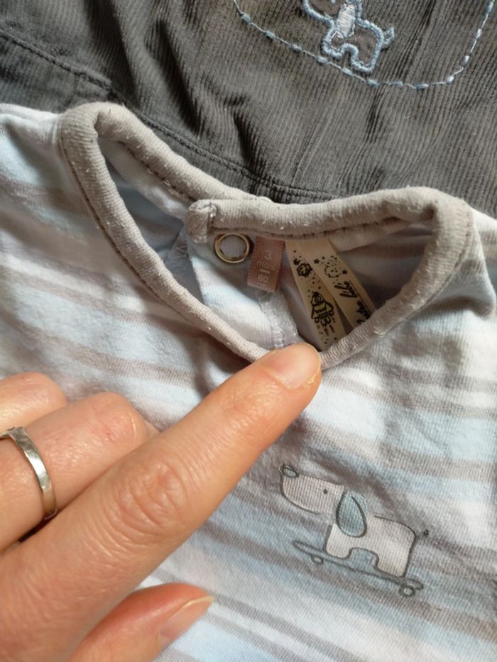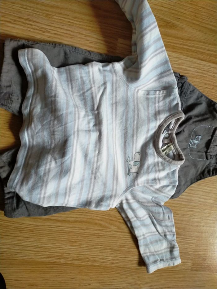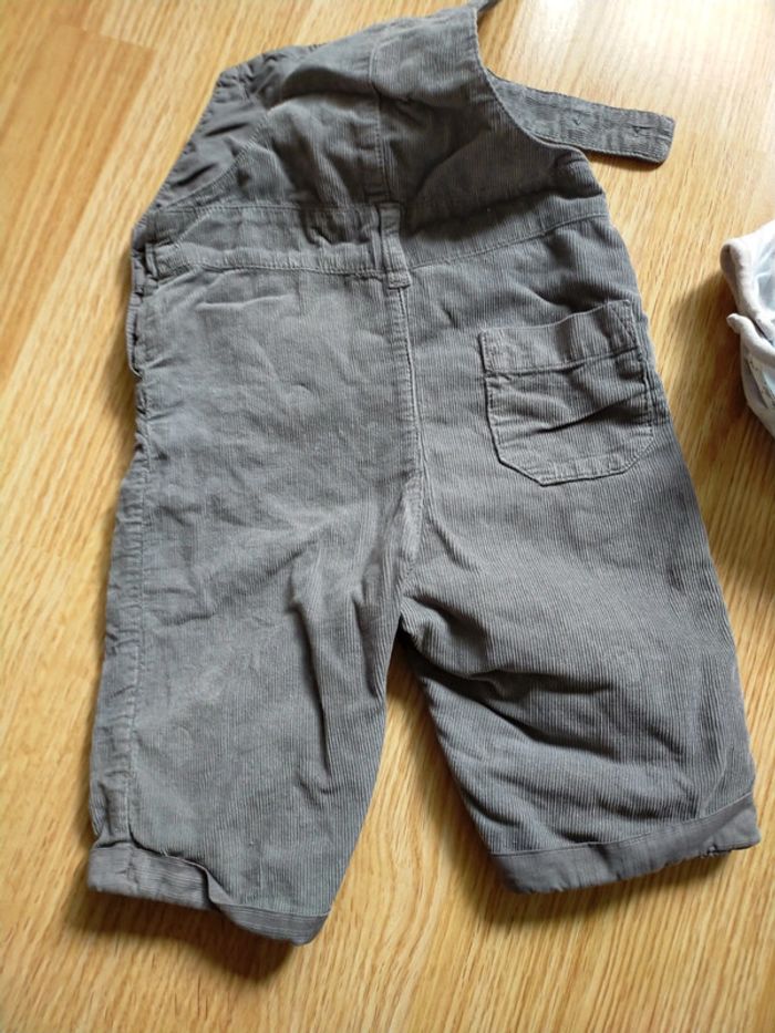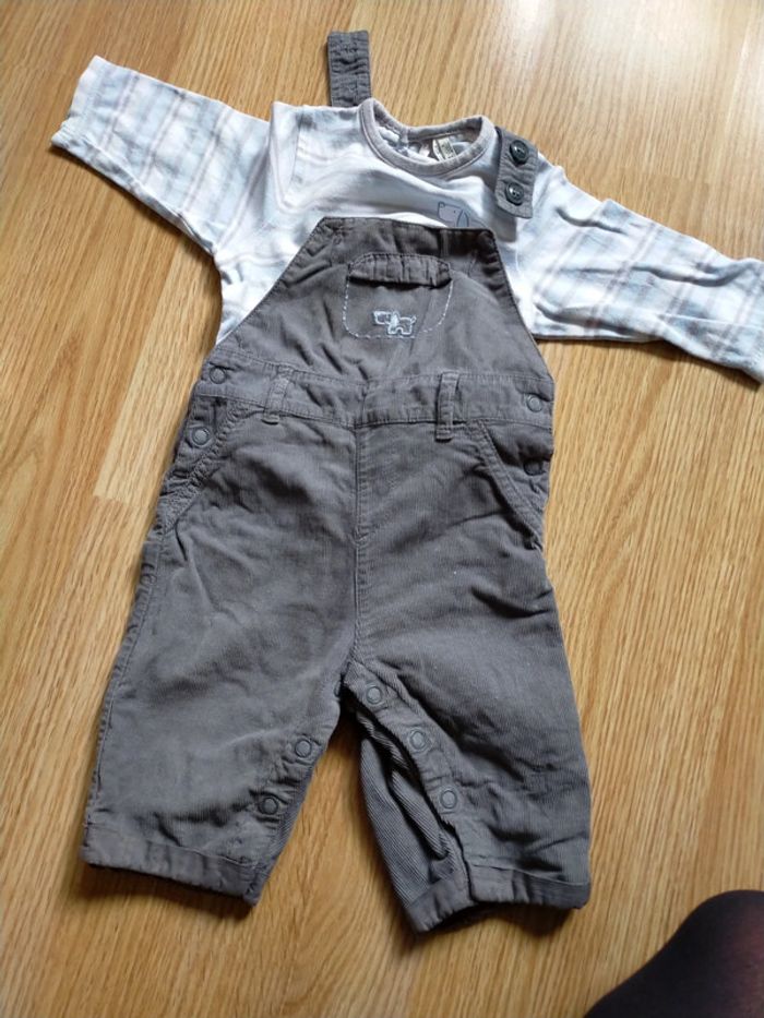 Salopette en velours côtelé gris et son t-shirt rayé bleu manches longues. Utilisé très peu de temps pour mes deux garçons qui étaient costaud et n'ont pas pu la mettre plus de 3-4 fois chacun