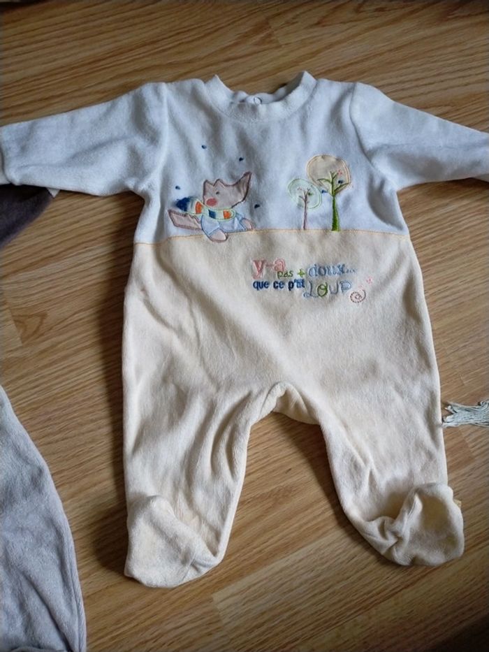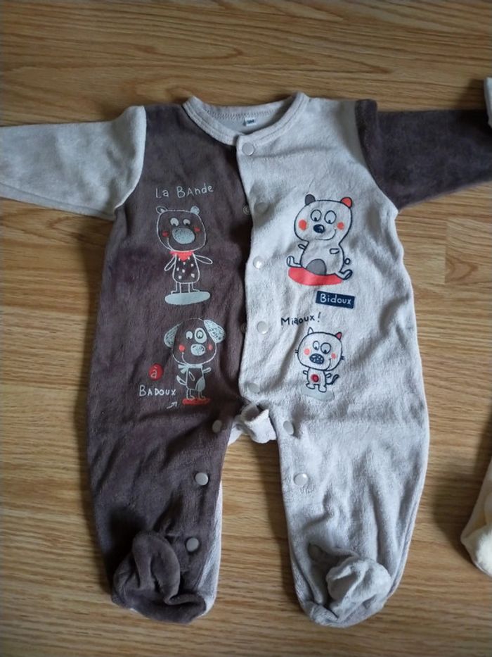 Lot 2 pyjamas 3 mois L'un à motif chats et chiens, beige et gris, attaches par le devant L'autre, absorba, motif loup, blanc et orangé, attaches classiques au dos