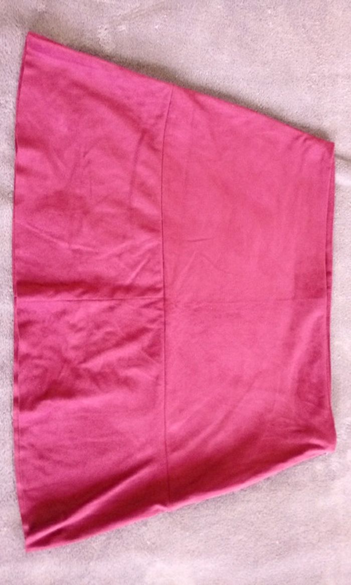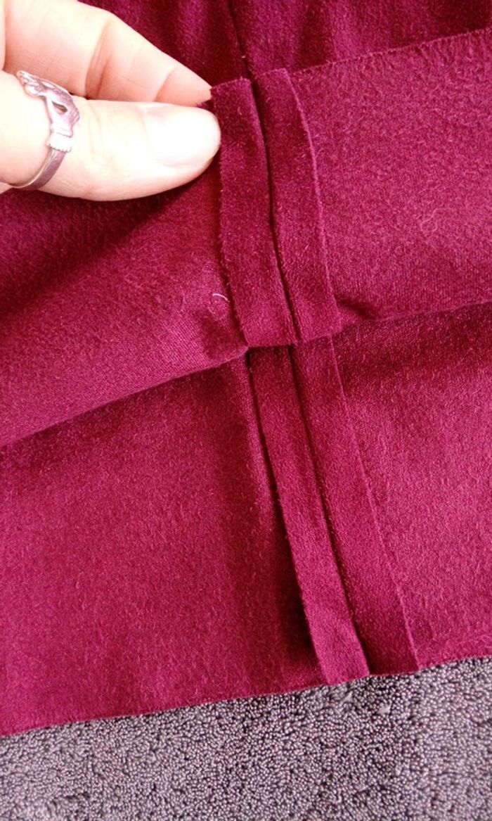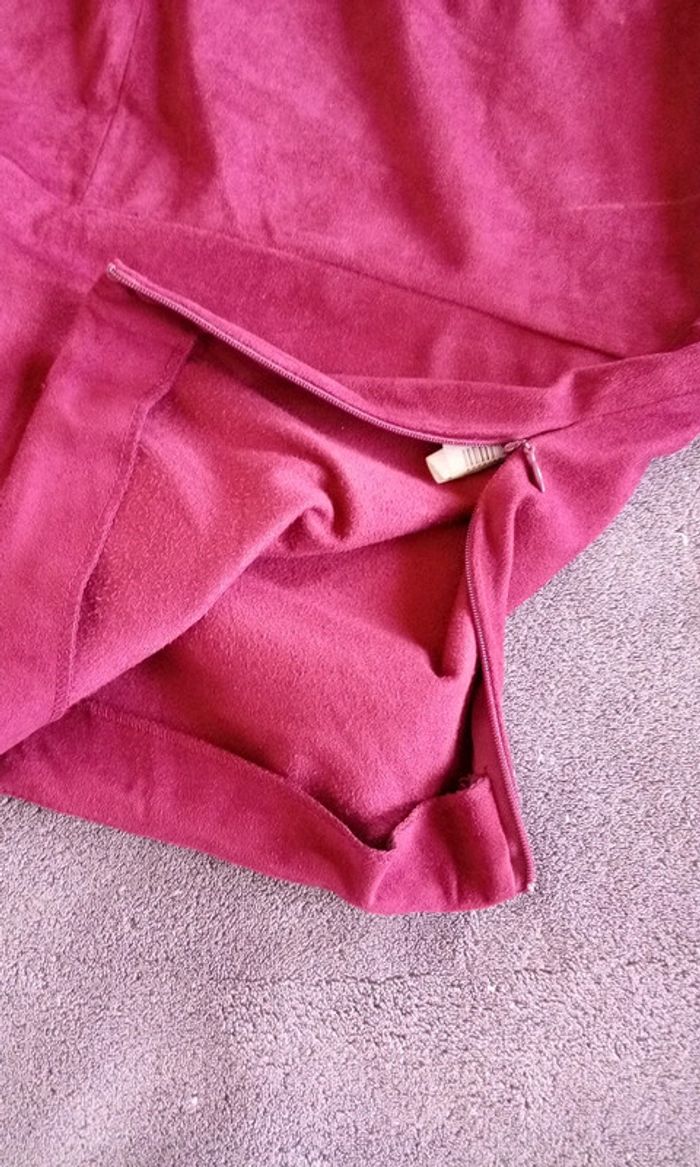 Forme évasée, fermeture par glissière côté. En velours ras. La couleur est trompeuse sur les photos, elle est vraiment bordeaux, pas rouge ou rose. Très peu portée. Taille bien