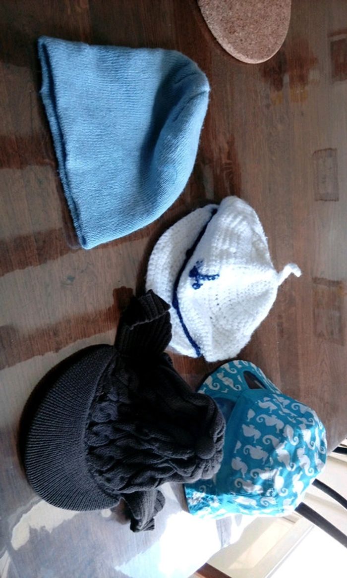 Un bonnet, un bob neuf, une casquette en tricot et une gavroche en tricot. Taille 43 (plus ou moins)
