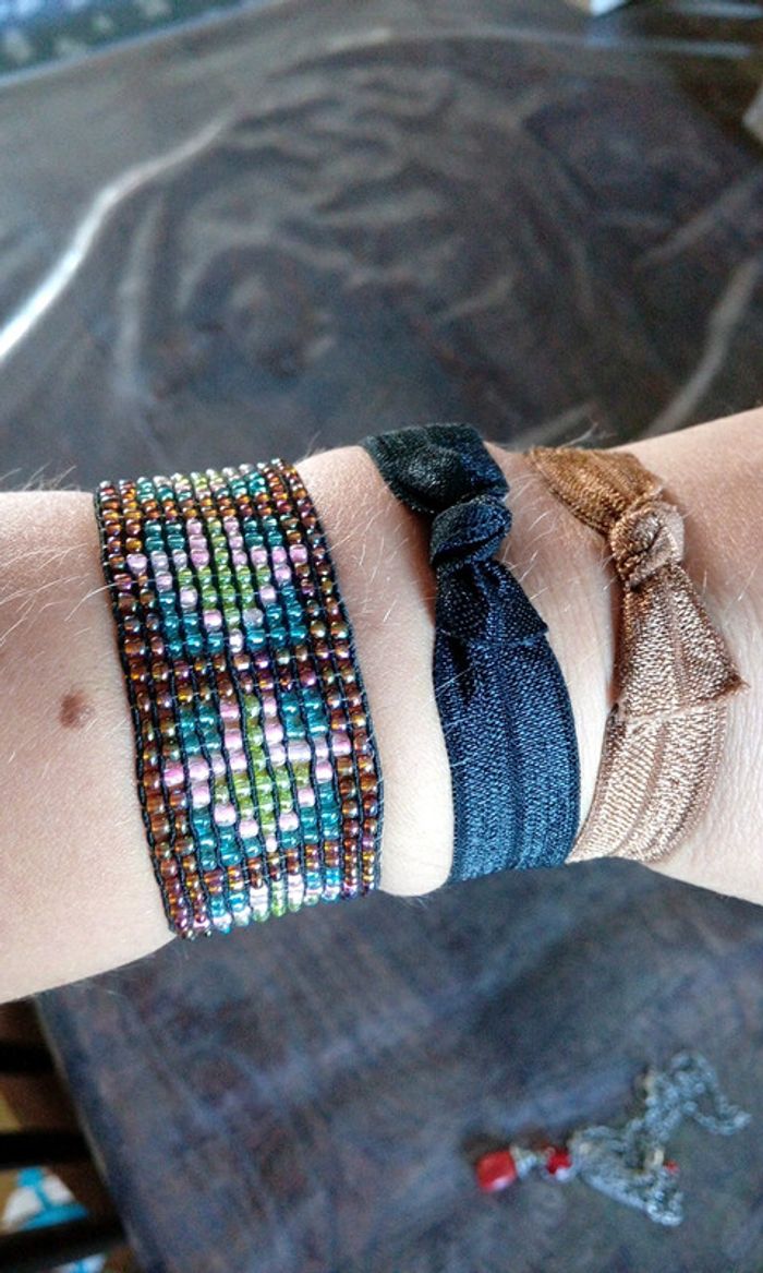 Un bracelet en tissage de perle, deux bracelets en ruban brun et noir