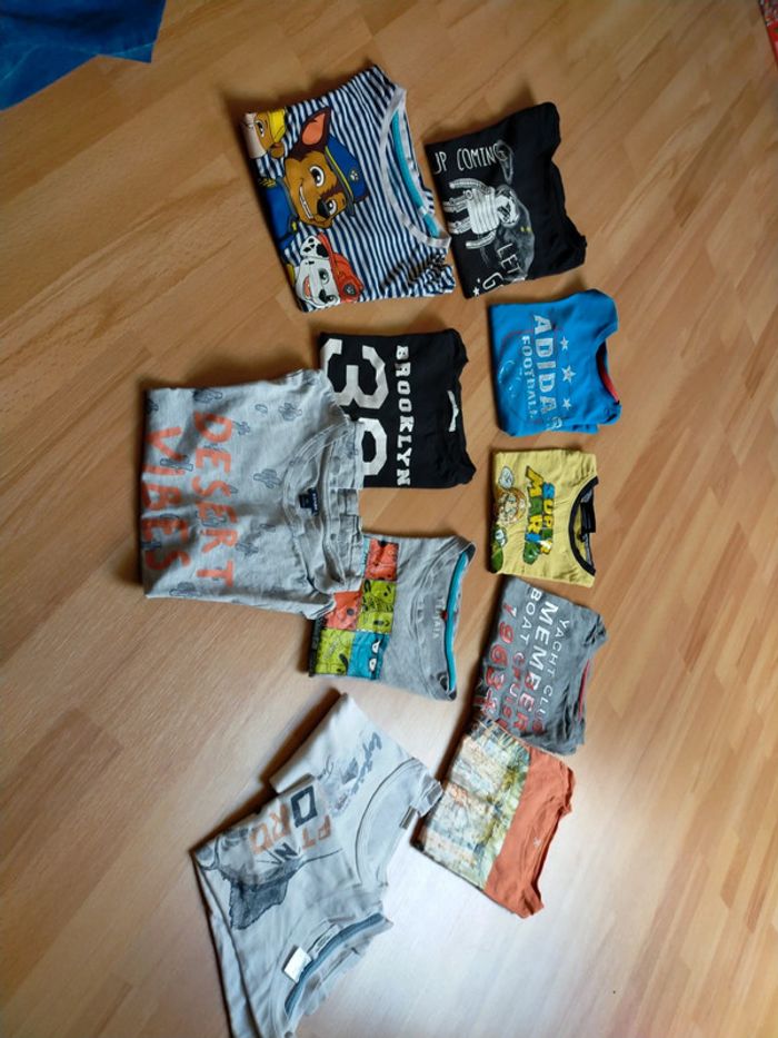 Tous portés, qq défauts de flocage sur le Adidas, le super Mario et le Okaïdi Le pat patrouille est en très bon état Diverses marques