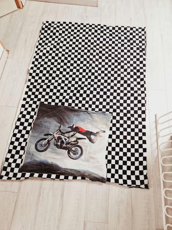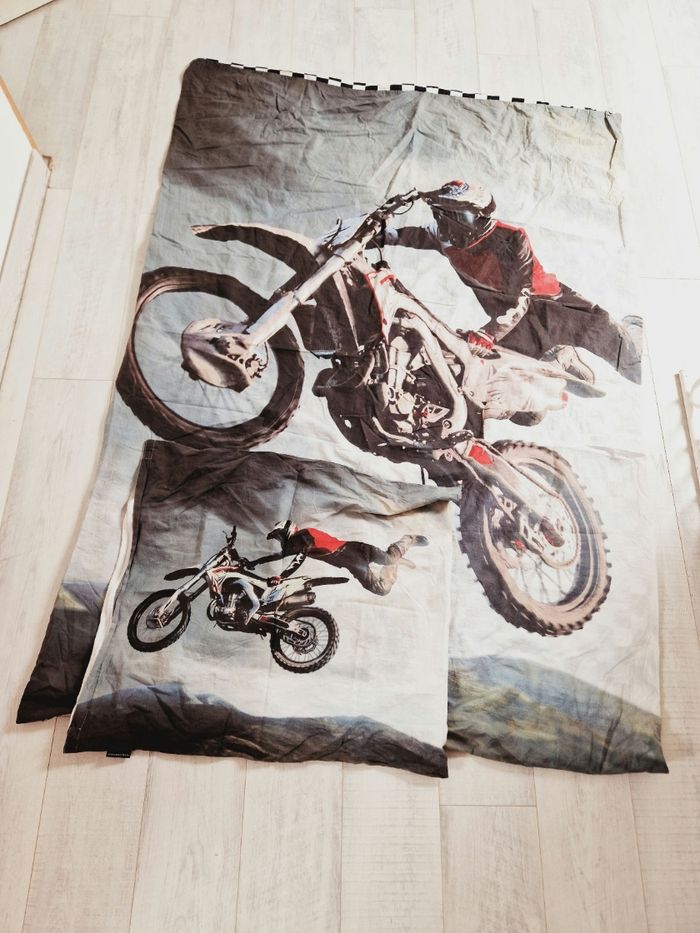 Parure de lit une personne moto cross et un pilote. Housse de couette+ 1 taie d'oreiller J'ai mis en photo les fermetures éclairs car elles ne sont pas cassés, je l'ai reçu comme ça. Servis 1 fois.