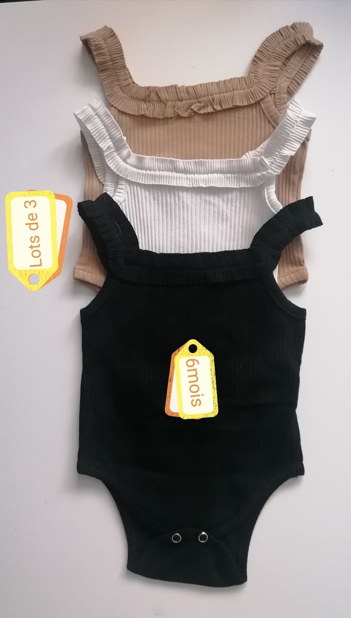 Lots de 3 bodies filles A Bretelles non réglable 6mois ( 70cm) . Noir /blanc /beige. Matière élastique Neuf sans étiquettes Le lots 12€