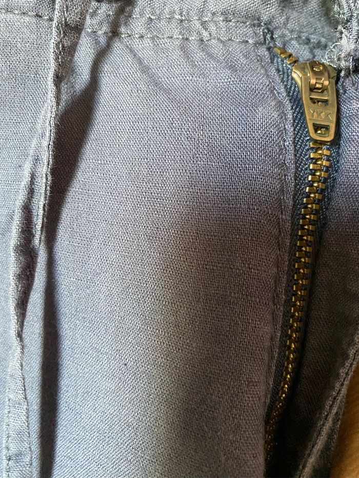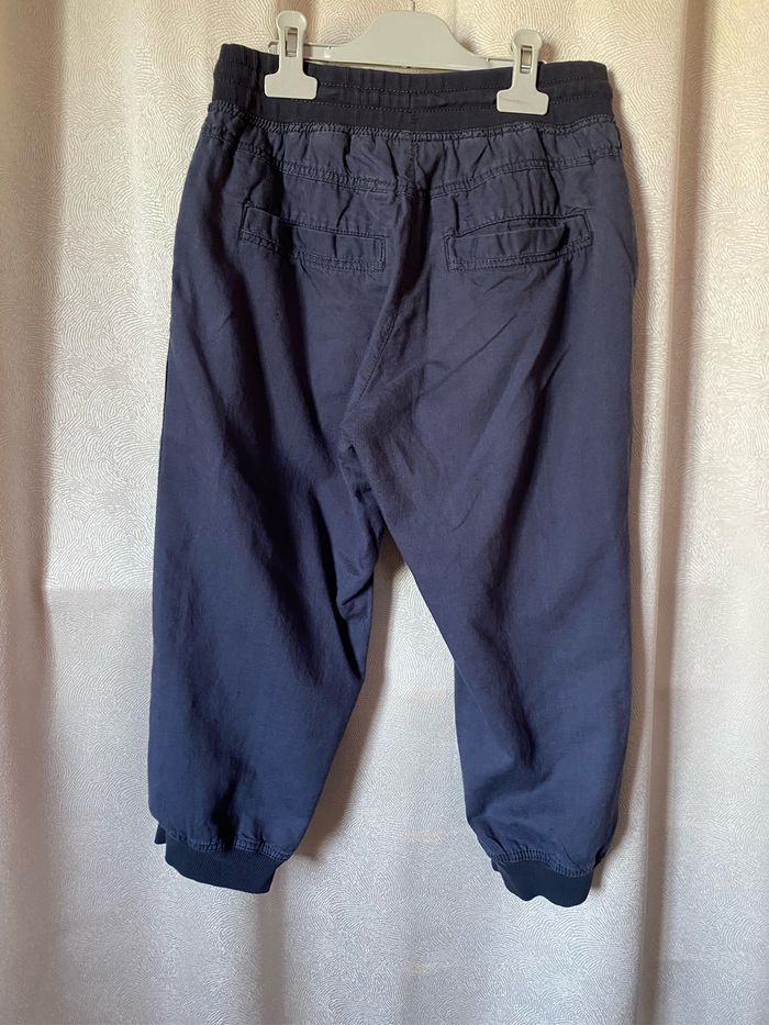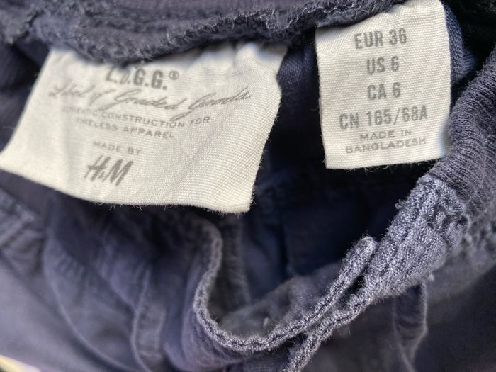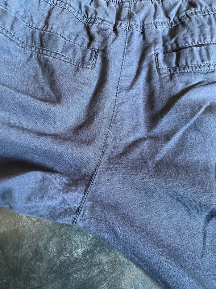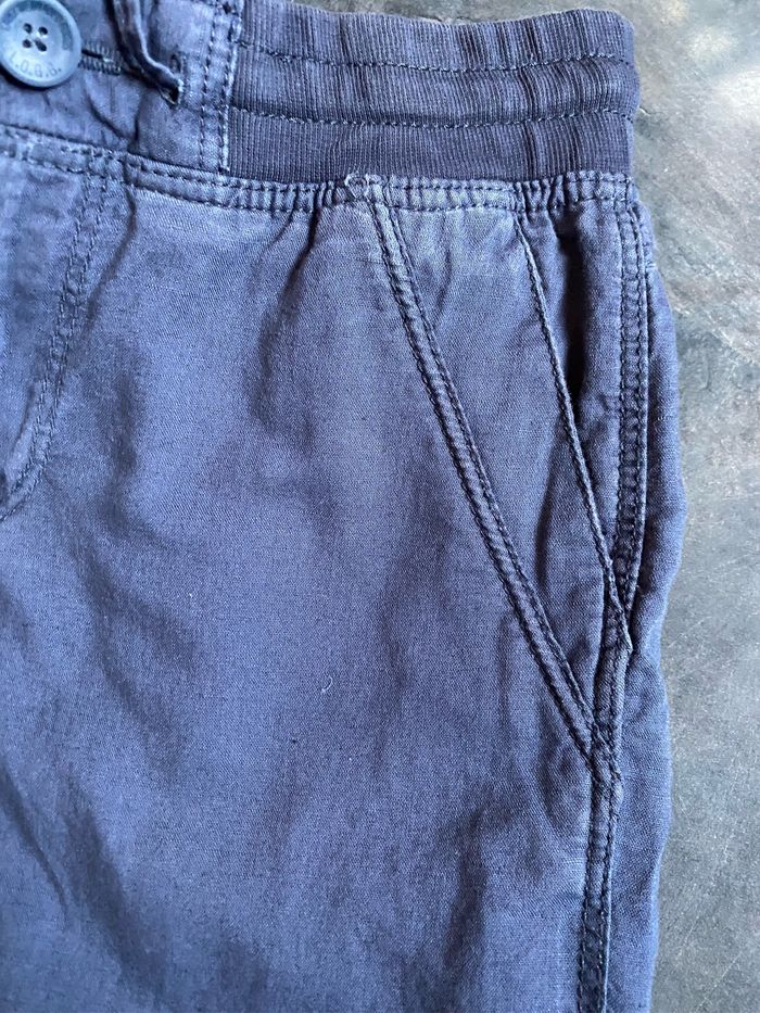 Pantacourt bleu marine , ceinture bord côte souple. Cordon de serrage à la ceinture Taille 36 Plus d’étiquette de composition ( coton, peut-être un peu de lin) Couleur un peu passée par le lavage sinon très bon état Marque H&M