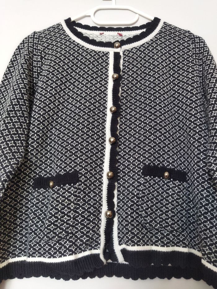 petite veste en tissu noir et blanche avec un petit col qui peut se porter en gilet ou en haut avec deux petit poche de chaque coté, article jamais porter mais tout les étiquette on était couper je ne connais donc pas la marque. tissu très doux.