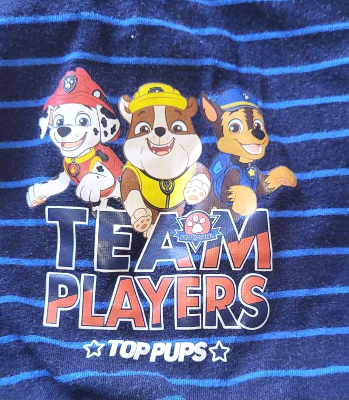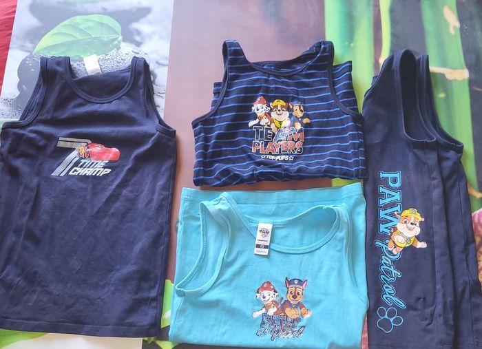 Lots de 4 maillots de corps pour garçon de 7 à 8 ans. 3 maillots à l'effigie de la Paw patrol et un à l'effigie de Cars. Porté quelques fois sans défaut majeur. 95% de coton et 5% d'elastane.