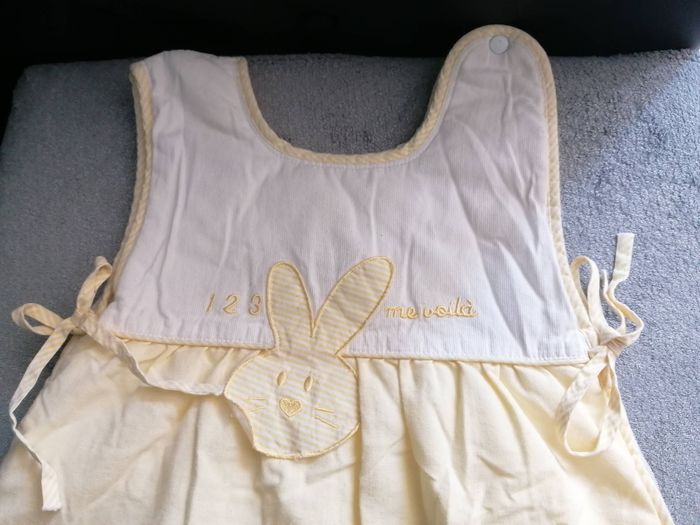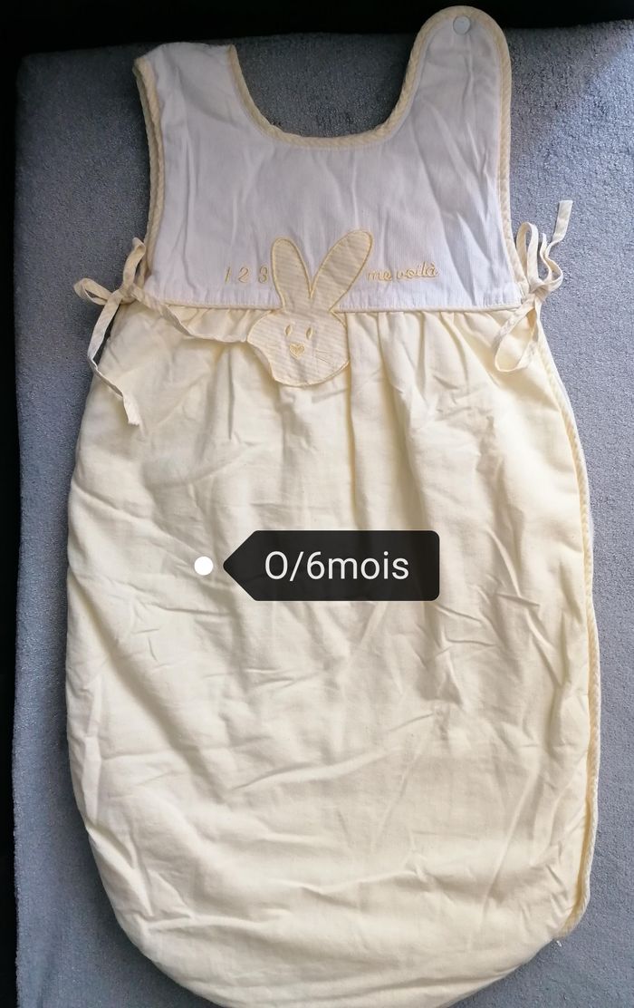 Gigoteuse bébé Marque kiabi Age : 0/6mois Matière : pour hiver Doublure chaude Couleur : jaune /blanc Ouverture zippée sur un côté. Portée, aucune tache 5€