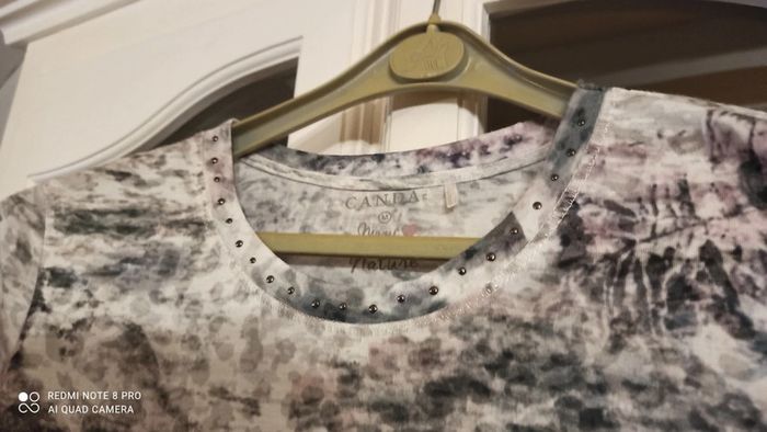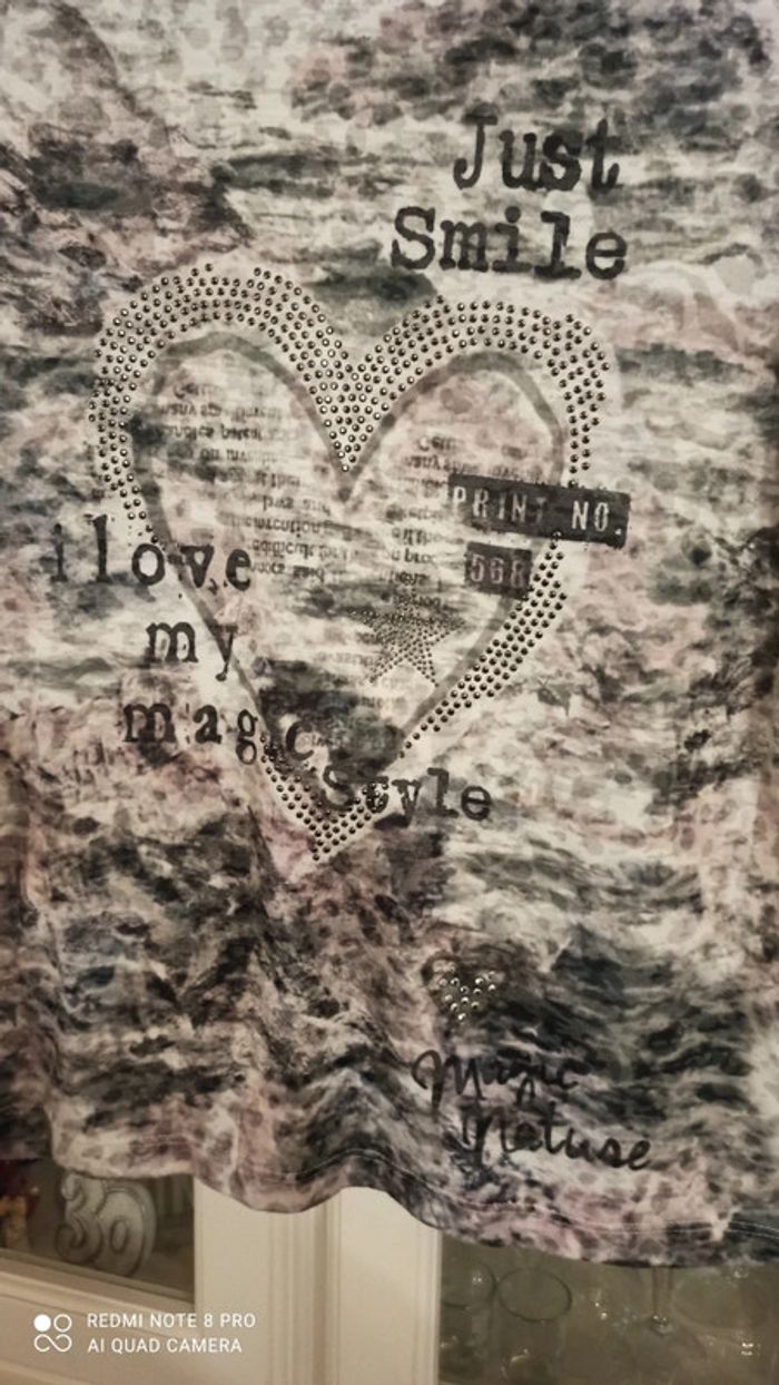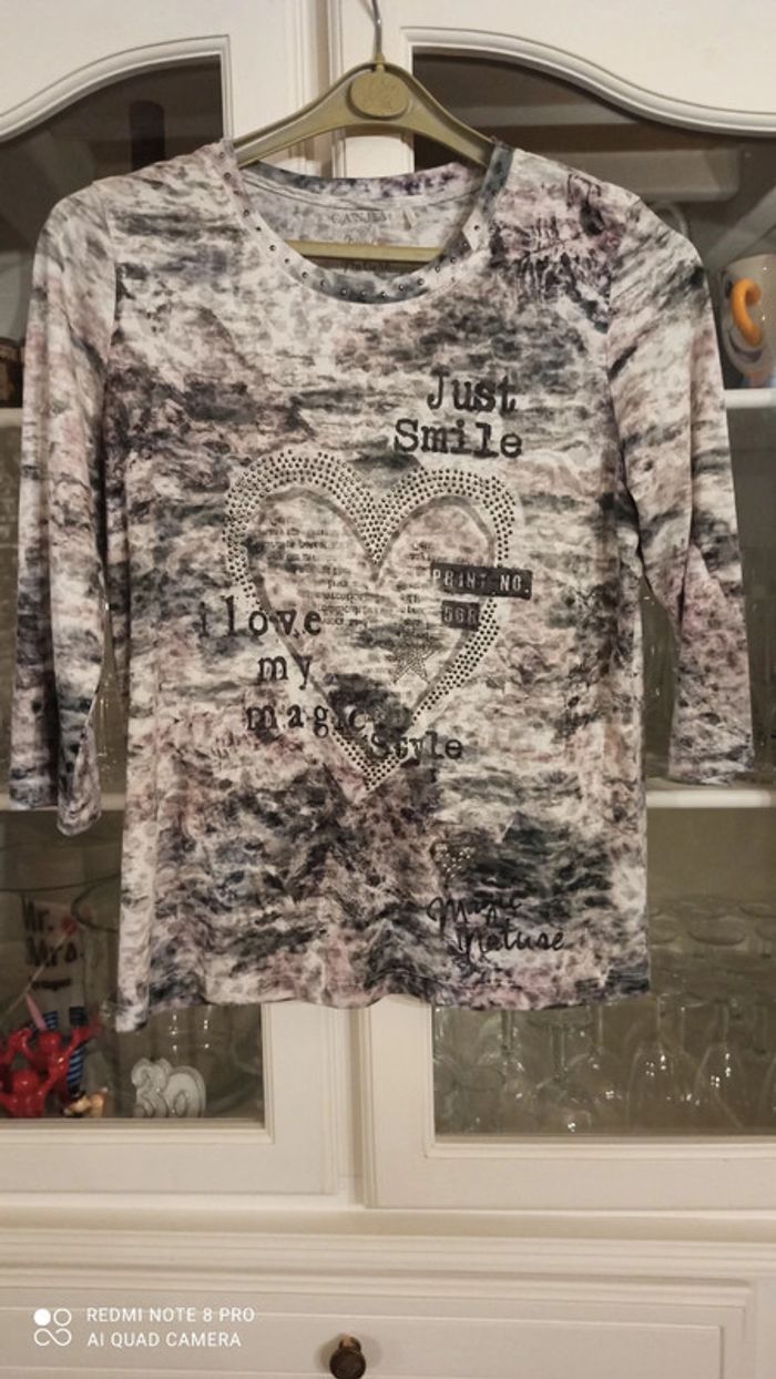 Haut imprimée nuances de gris clair , gris vert, rose parme et strass Comme neuf Manches 3/4 Taille M