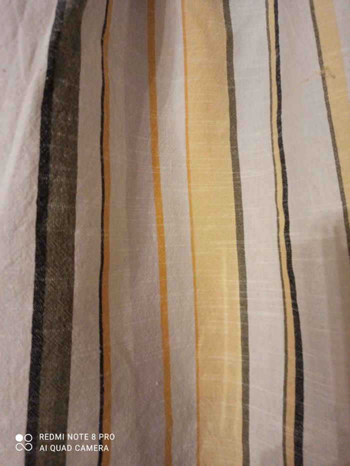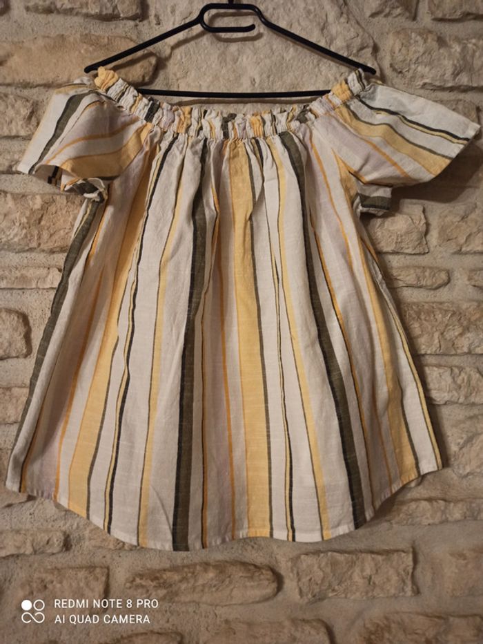 Blouse en 100 % coton Élastique au niveau de l'encolure pour la porter soit sur les épaules ou épaule dégagée Blouse blanche rayures jaune /kaki/ noir Jamais porté Taille L