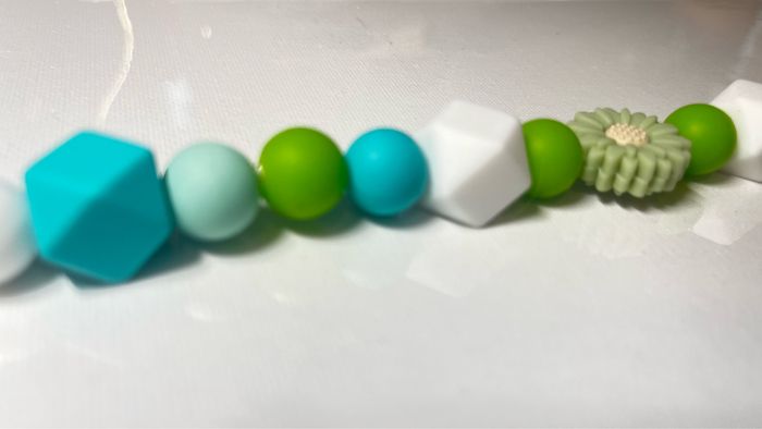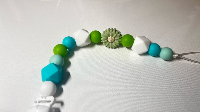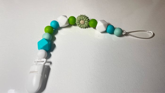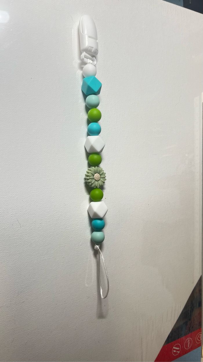 Attache tétine en perles de silicone Couleur bleu, vert, blanc et turquoise Fait main