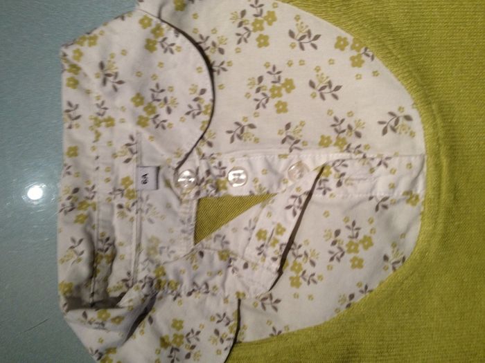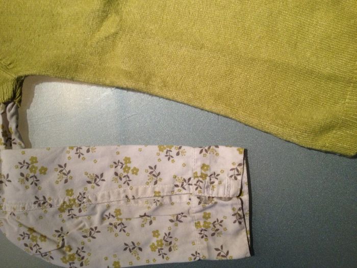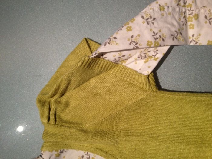 Chemisier avec petit pull léger accroché , seul les manches et le col sont en toile de chemise le reste c'est petit pull,vert.anis, des petites bouloches sur le vert anis #fille6_mondressing11_bv