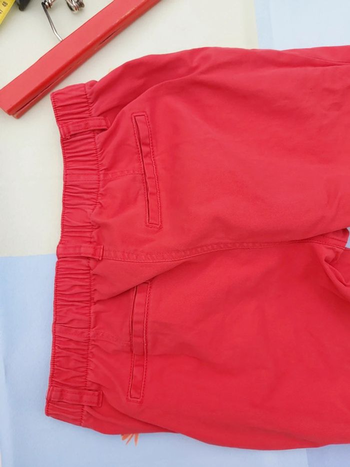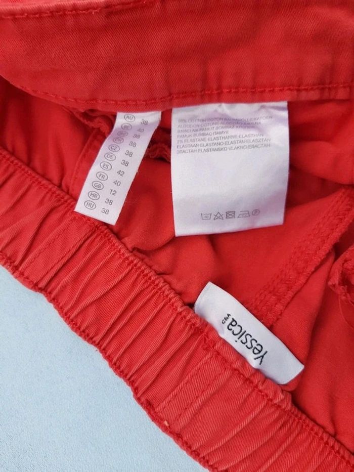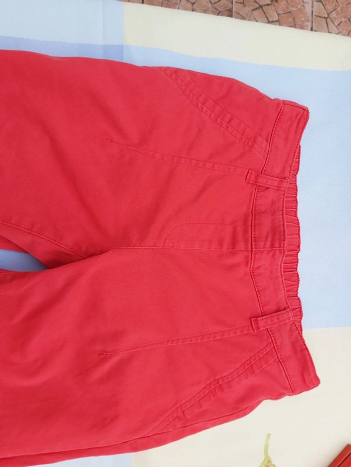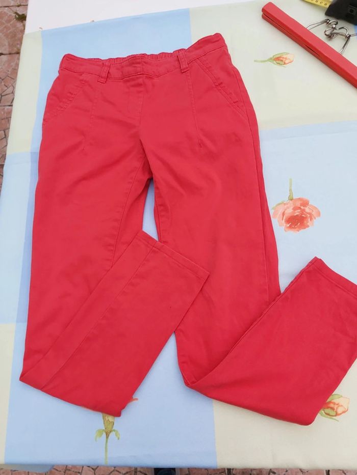 Pantalon rouge, pinces à l'avant, taille élastiquée dans le dos, 3 fausses poches, passants de ceinture. #clairou44_femme40