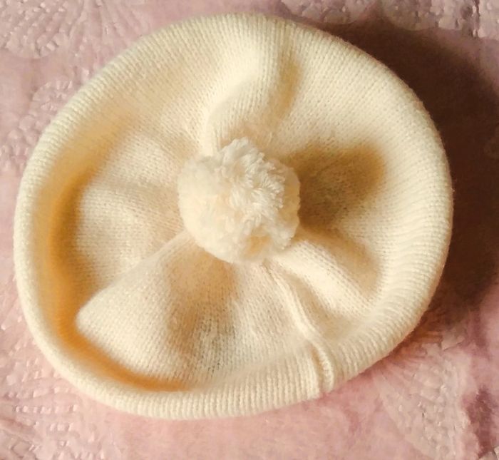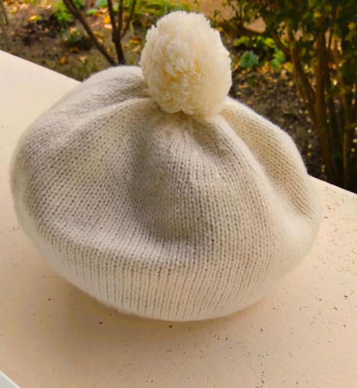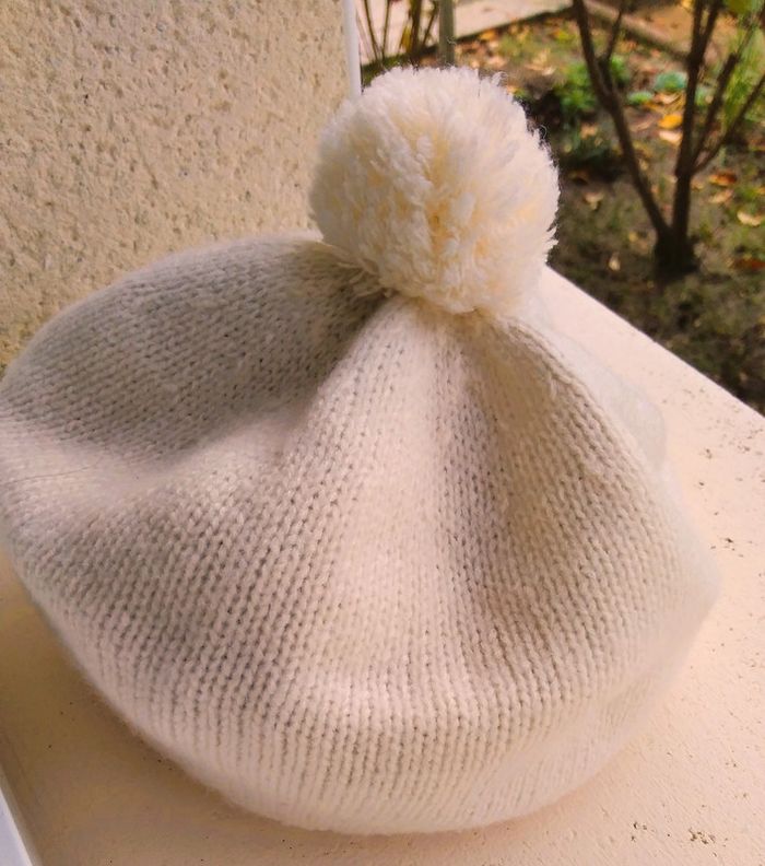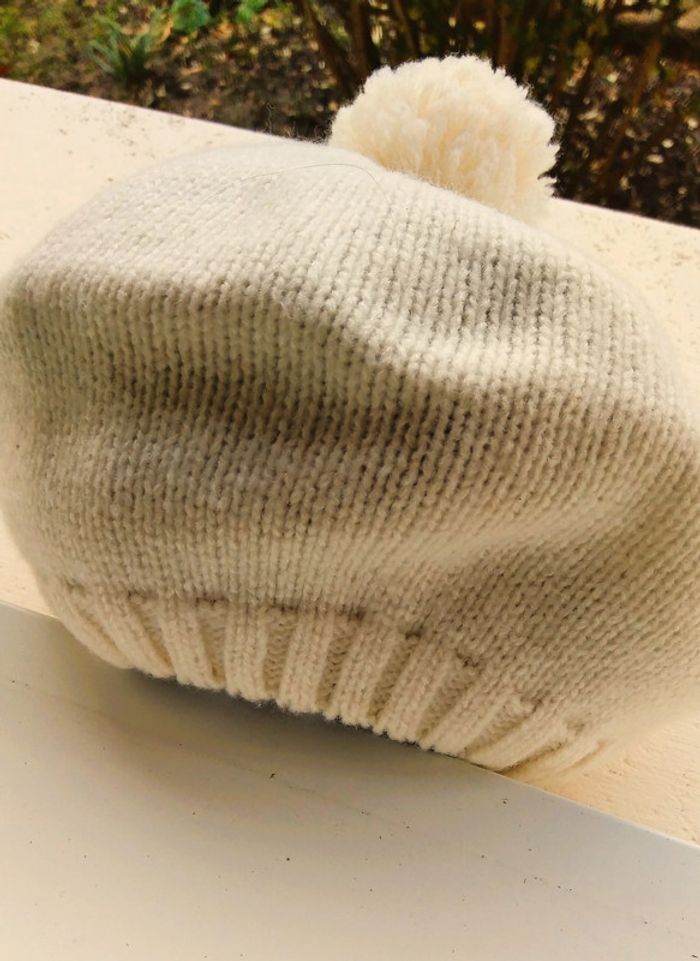 jamais utilisé laine + polyamide + acrylique + élastane très doux bord cotes à la base 35 cm de circonférence environ hauteur 17 cm (sans le pompon) coloris IVOIRE