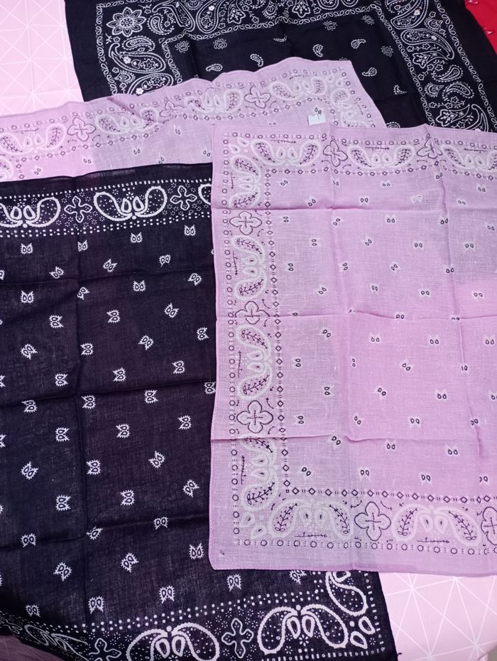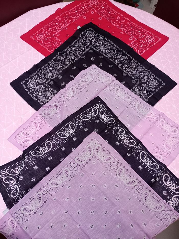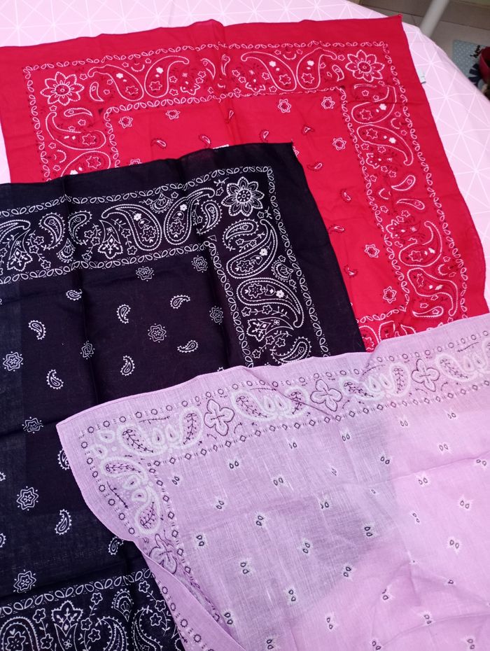 Lot de 5 bandanas. 2 noirs, 2 lilas et 1 rouge. +- 51 cm x 51 cm. 100% coton. Très bon état.
