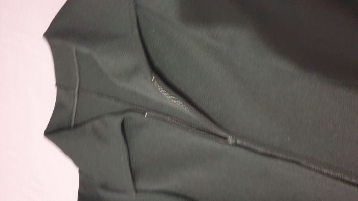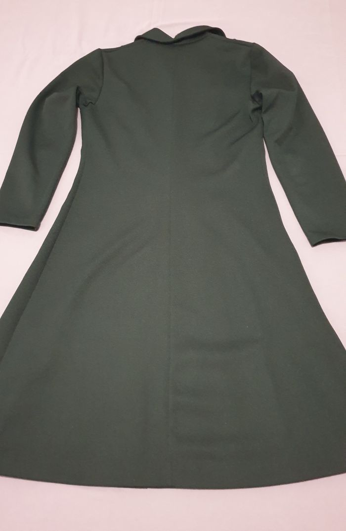 Robe noire, évasée à partir de la taille, longueur sous le genou, fermeture à glissière à l'avant du col à la taille (permet de choisir la profondeur du décolleté), col chemisier, manches longues. Peut se porter avec ou sans ceinture.