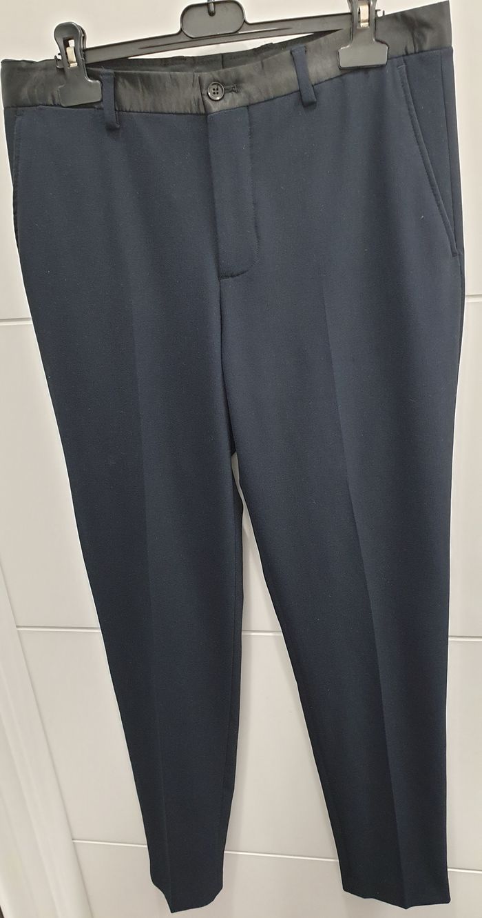 Pantalon de smoking / costume ZARA homme Bleu marine avec taille en satin noir Poches avant et poches passepoilées à l'arrière. Fermeture éclair et double boutonnage. T. 40 / M - coupe slim Comme neuf : porté une fois puis lavé une fois #pourleréveillon