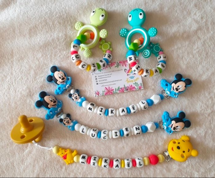 Coffret composé de: - 1 Attache tétine de la collection Winnie - 1 Tétine silicone - 2 Attaches doudous de la collection Mickey - 2 Hochet de la collection Tortue Respect des normes CE, composée de perles silicone alimentaire et/ou bois naturel. 100% personnalisable, énormément de choix de clips, perles, etc… Envoyez-moi un message afin de créer main dans la main votre accessoire idéal.