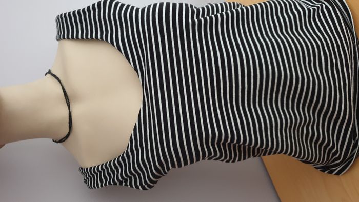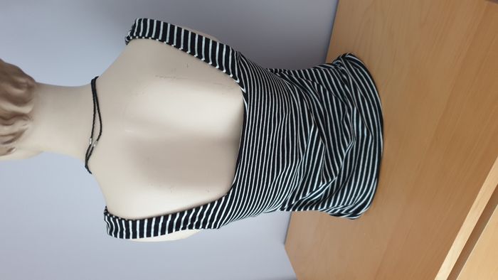 Débardeur rayé noir et blanc, doublé au niveau de la poitrine - devant, décolleté en forme d'ogive, dos largement décolleté - Taille L - TB état - 1 rang ras-du-coup perles inclus (sur demande) ou 3 autres tops achetés, celui-ci en cadeau.