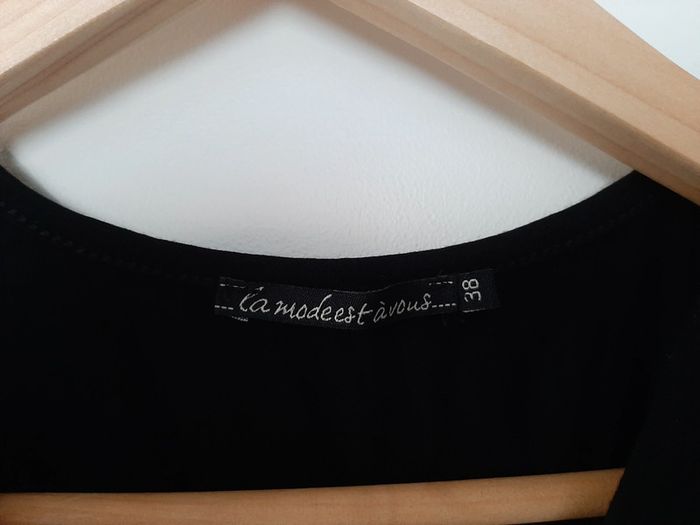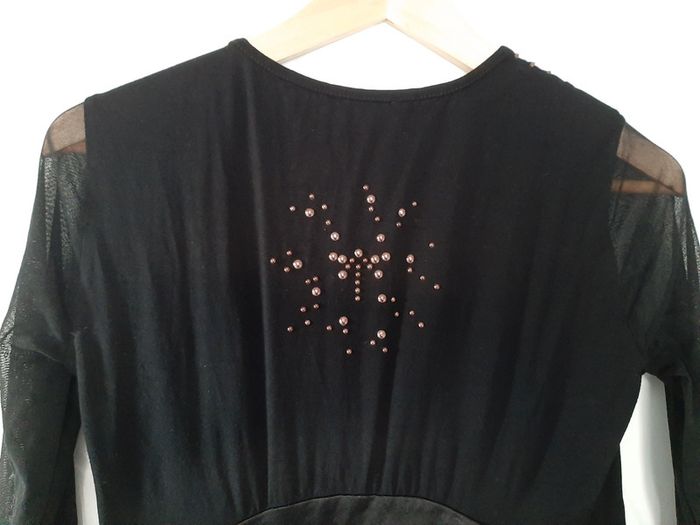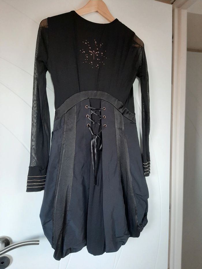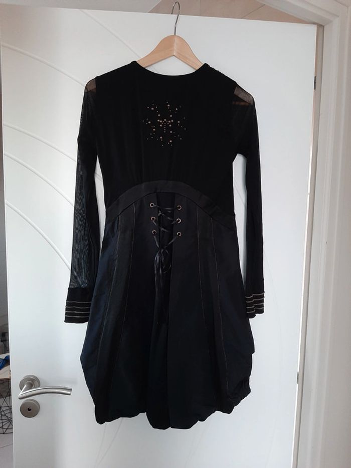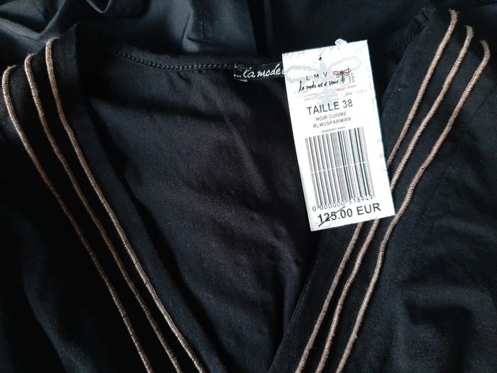 Robe neuve avec étiquette, voilage au niveau ses manches. Couleur noire avec des motifs cuivrés brillants.