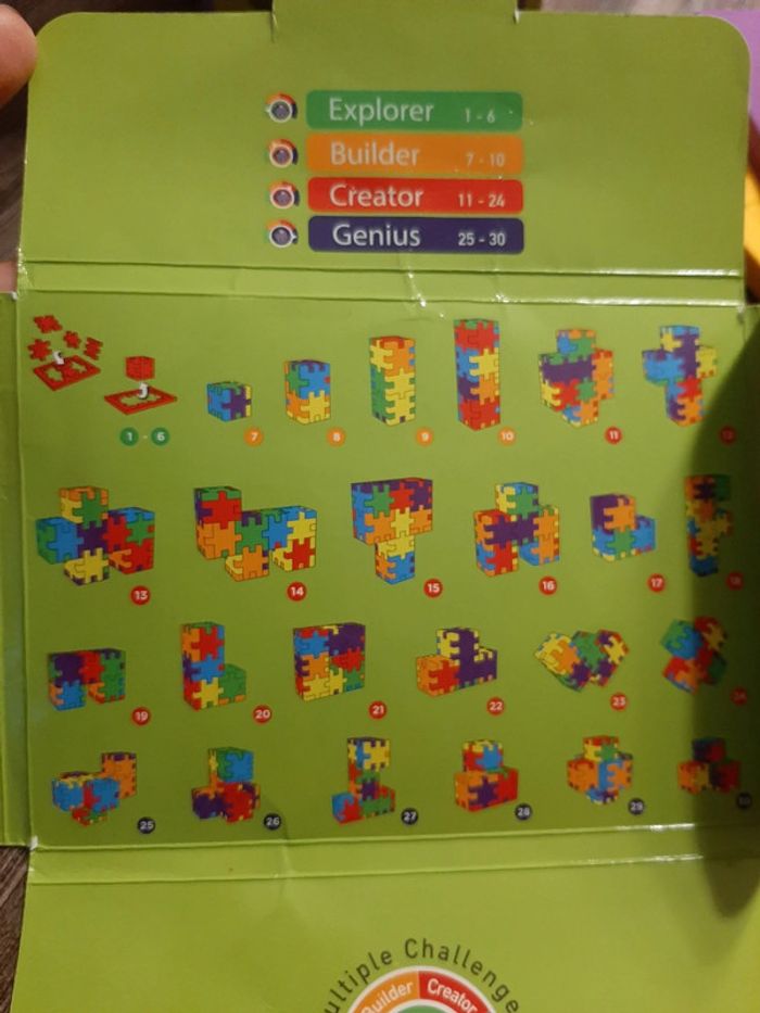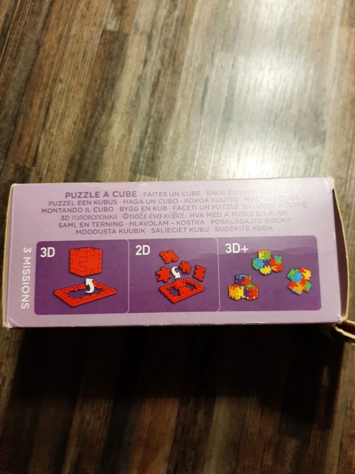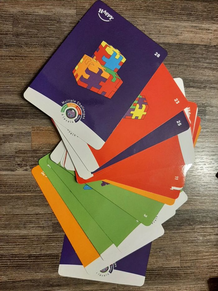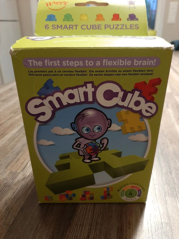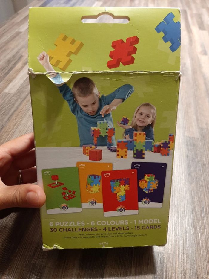 Smart cube en TBE Comprend : - 6 planches à puzzle - 15 cartes pour réaliser 30 challenges avec 4 niveau de difficultés Ce jeu permet de réaliser des cubes ou des formes spécifiques grâce à un paquet de cartes. Adapté aux enfants de 3 à 6 ans.