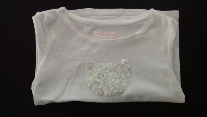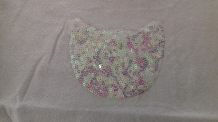 Tee shirt manche courte blanc, tête de chat pailleté en bon état, légèrement peluché.