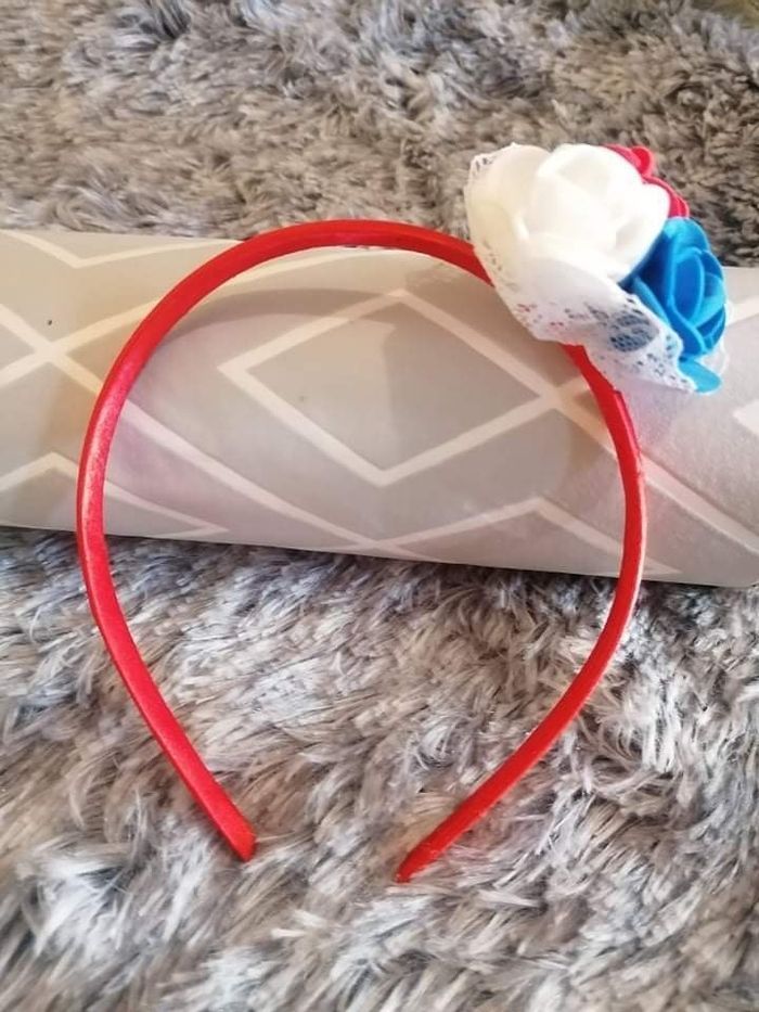 Serre tête avec fleurs artificielles bleu/blanc/rouge et dentelle blanche jamais utilisé