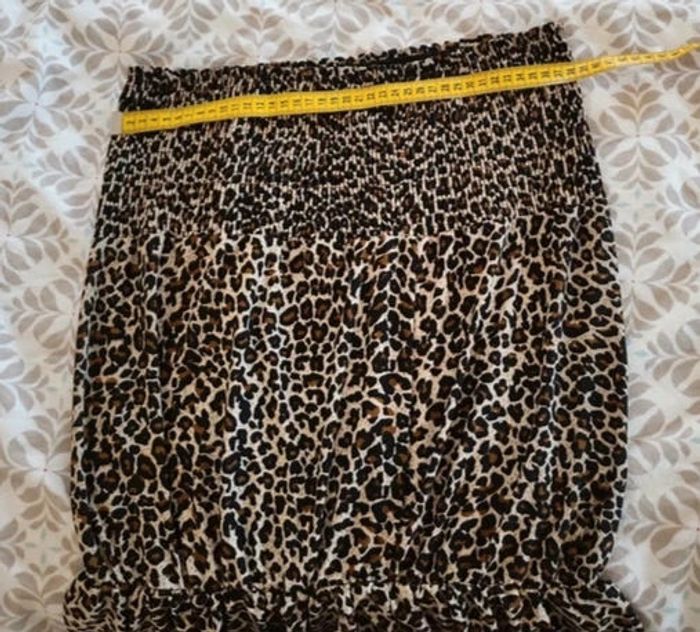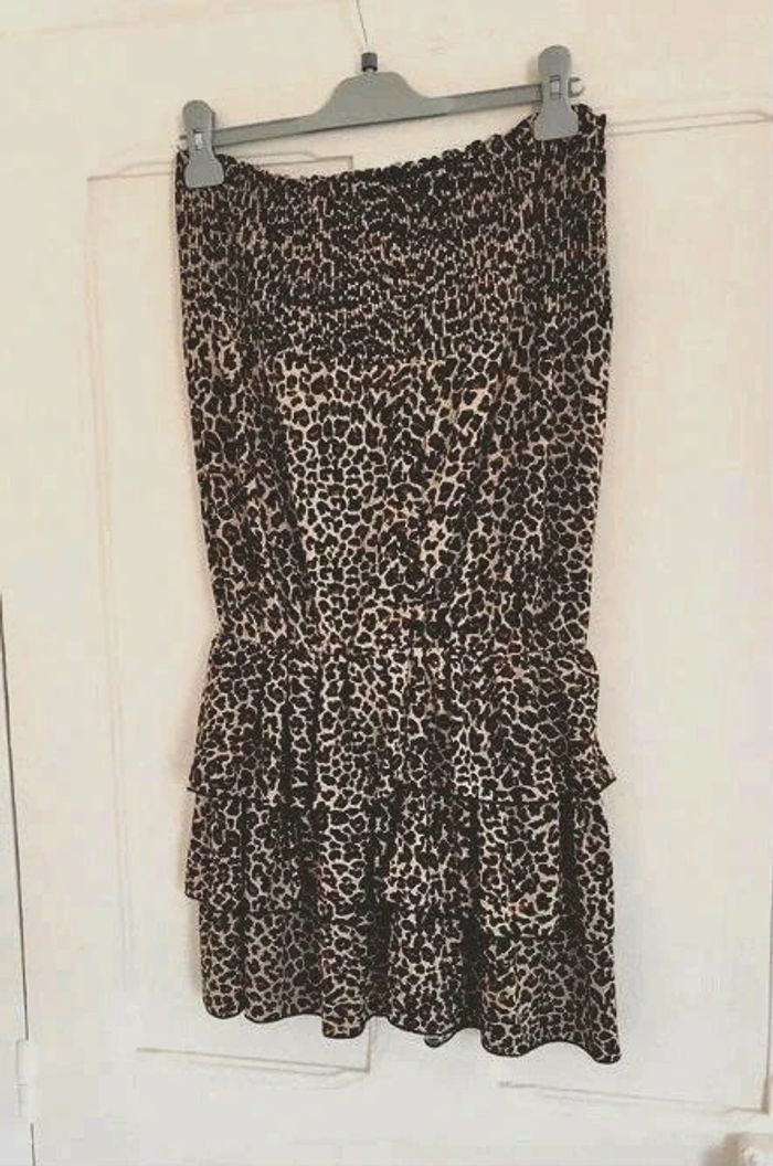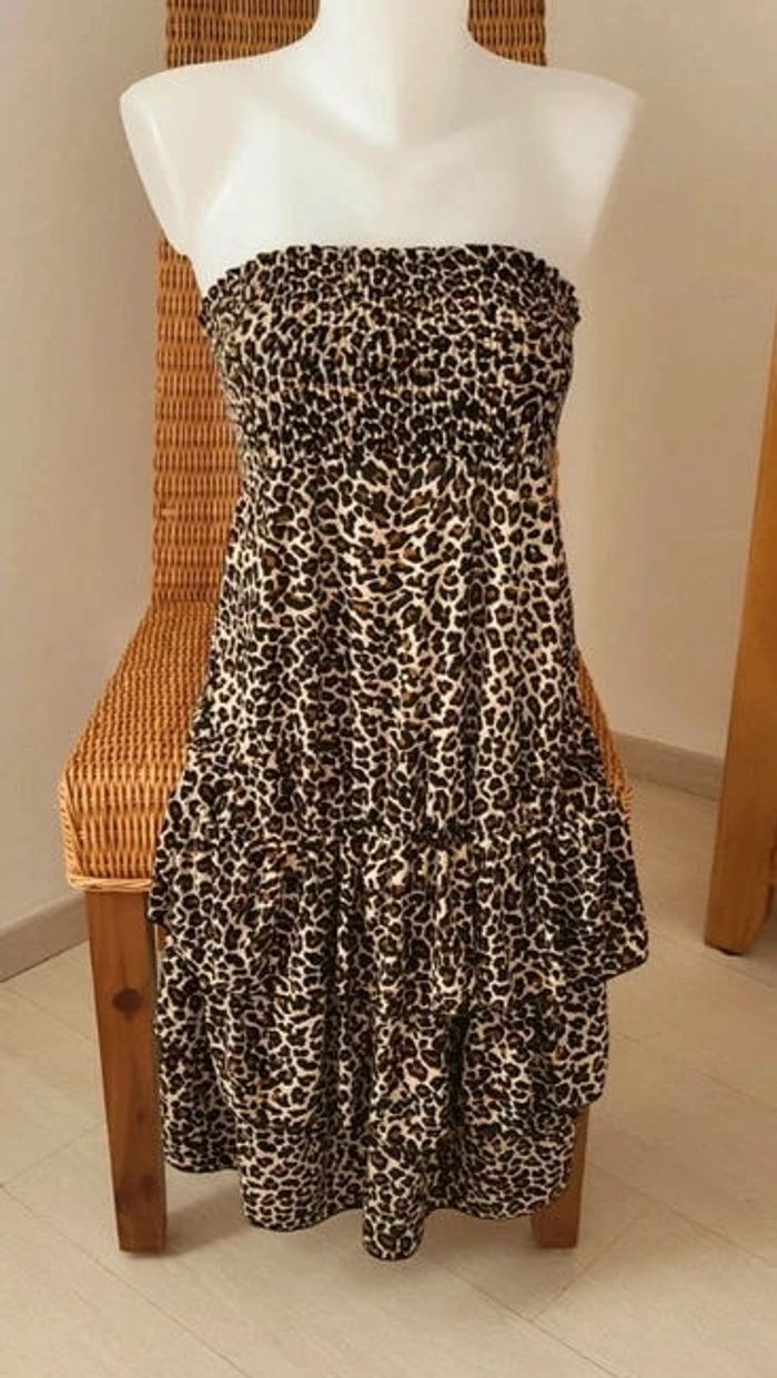 Robe très fluide avec épaules dénudées. Large élastique sur la poitrine (MINIMUM 40 CM) et élastique à la taille. Volants. Longueur de la robe 65 cm Belle qualité