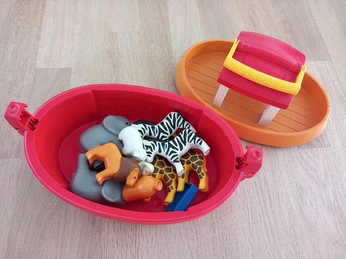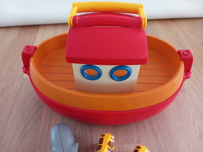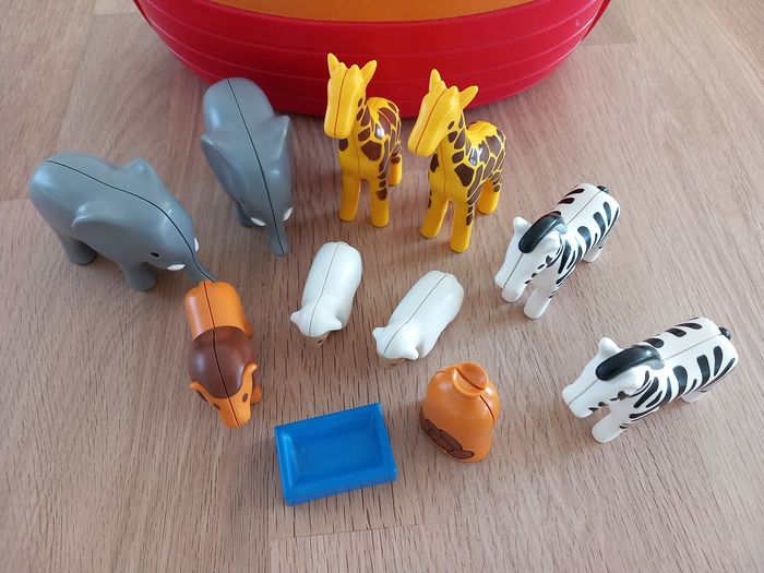 Arche de Noe Playmobil Le jouet comprend 1 arche, 2 éléphants, 2 zèbres, 2 girafes, 2 moutons, 1 lion, 1 mangeoire et 1 sac de nourriture Excellent état