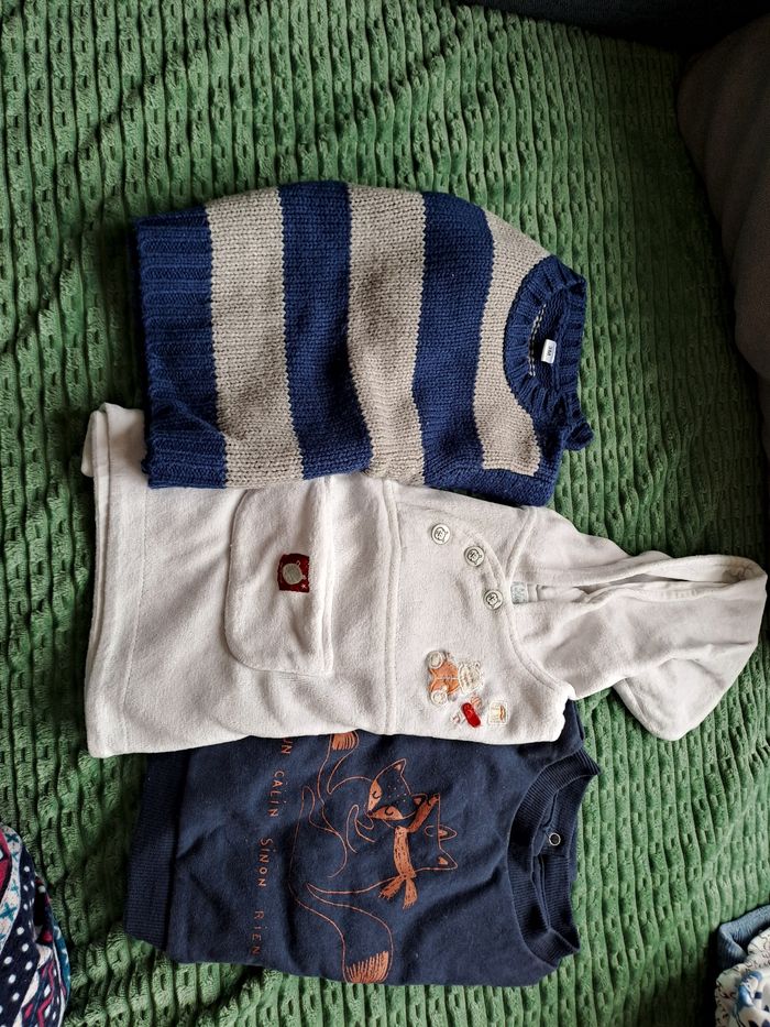 Lots de 23 vêtements pour garçon Que du 3 mois en très très bonne état Maison non fumeur 2 pantalons 1 salopette 1 veste style costume 2 pulls léger et 3 gros pulls 1 polo et 1 chemise 1 pyjamas léger et 2 chaud (combinaison) 1 manteau 7 bodys manche longue Et 1 court