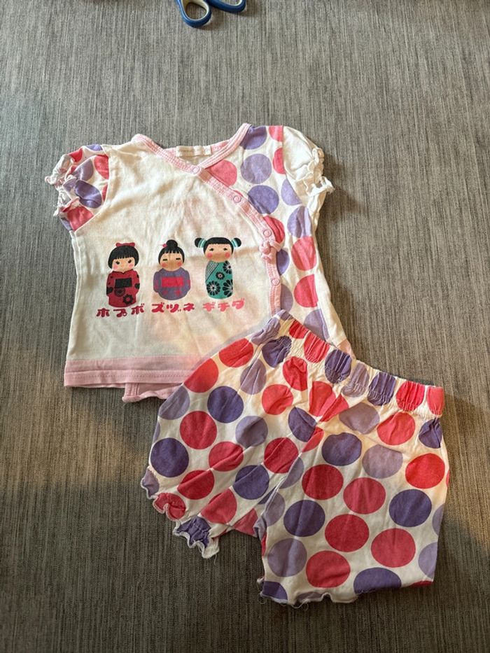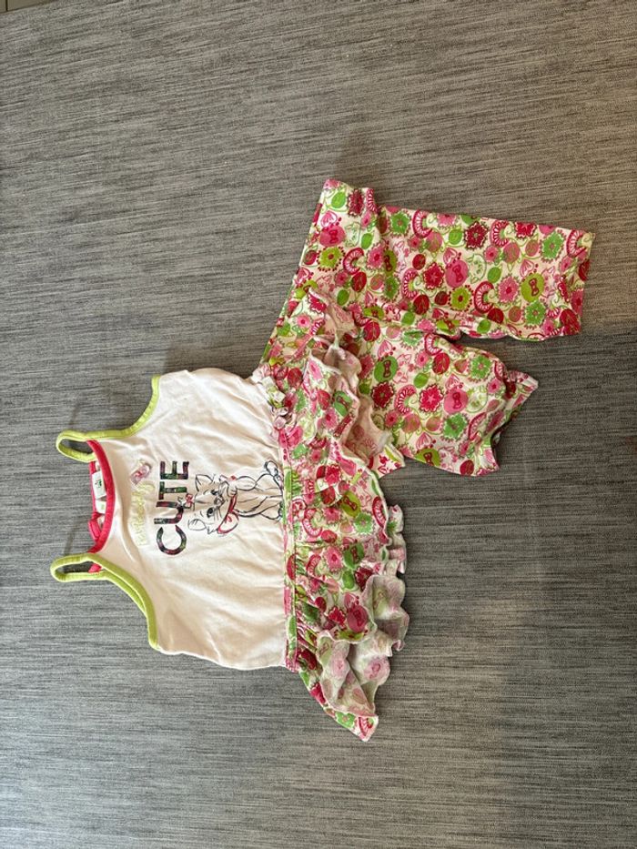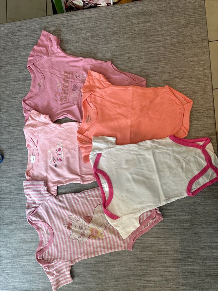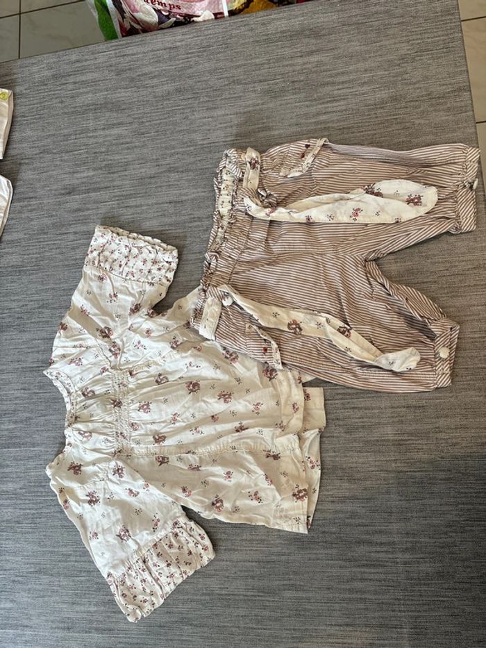 Lot de vêtements filles 9 mois 1 ensemble type kimono avec short court assorti Ensemble Gilet manches longues et pantalon assorti «  orchestra Ensemble teeshirt manches longues + legging KIABI Ensemble haut bretelles Et volant + legging assorti Disney baby 1 ensemble blouse manches longues boutons dos + pantalon assorti « sergent major 2 body sans manches TEX 5 body manches courtes