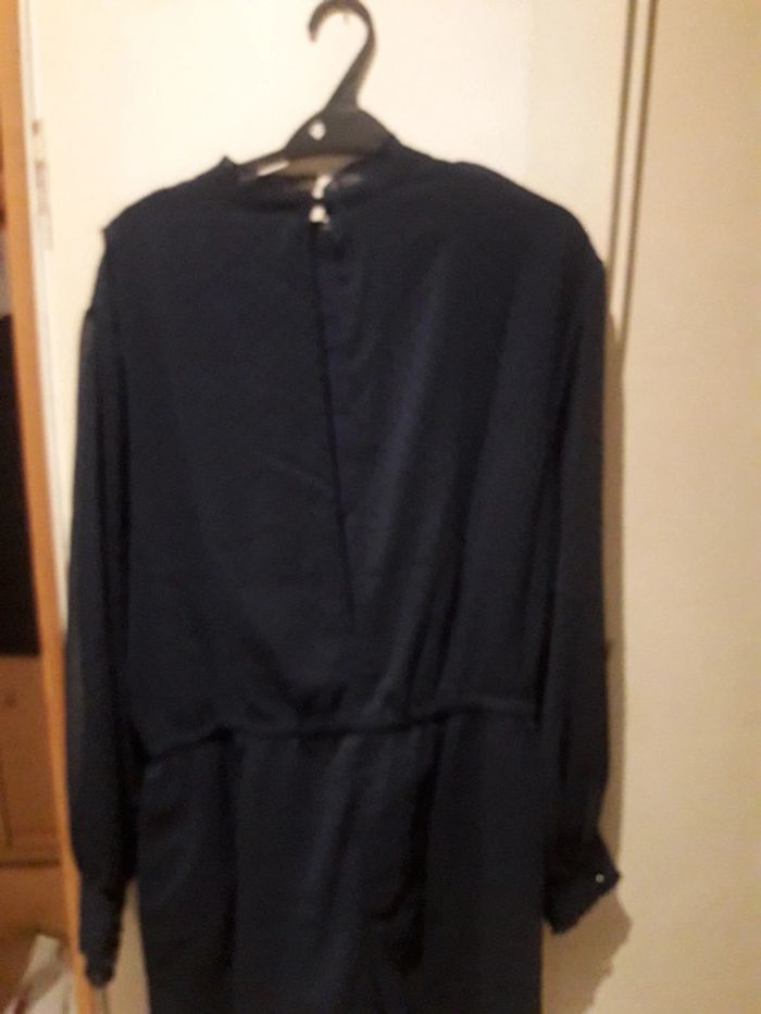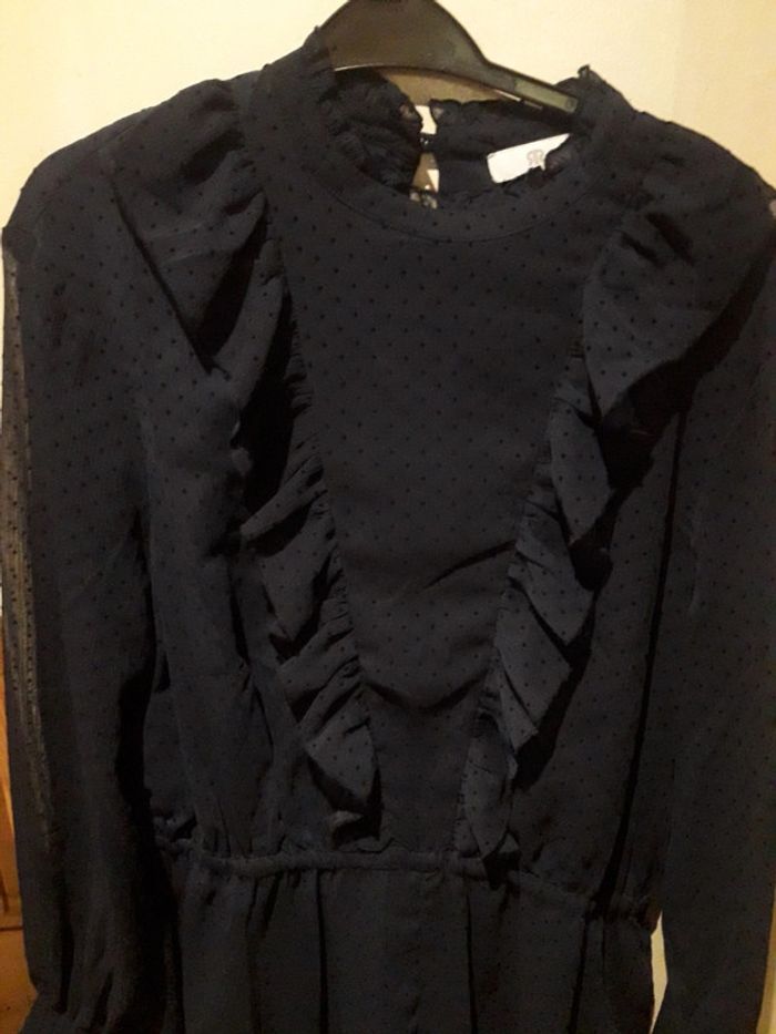 Neuf Elastiquee Pas de poches Poignets boutonnes Tissus voile plumetis noir Corps double manches transparentes Ouverture col Volant haut et col et poignets 100% polyester Doublure 100% viscose
