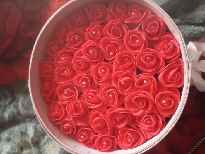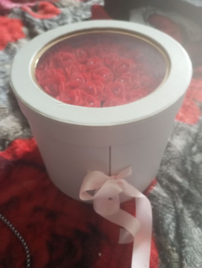 Coffret dans une boîte blanche avec un noeud rose et plein de petites rose ( fausse) rouge avec des perles nacrées