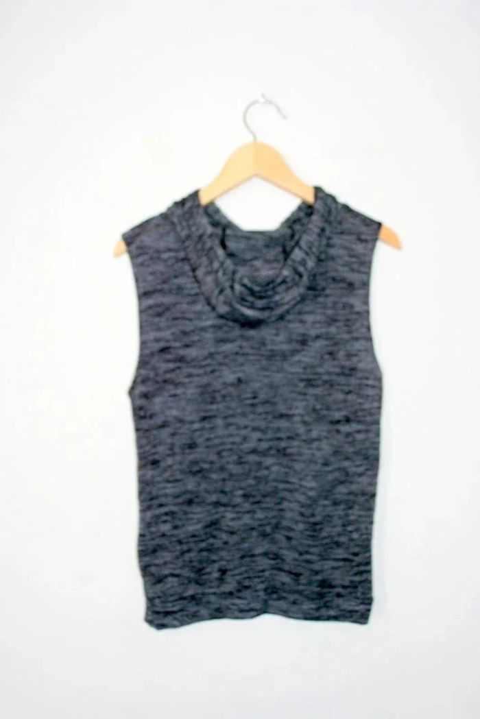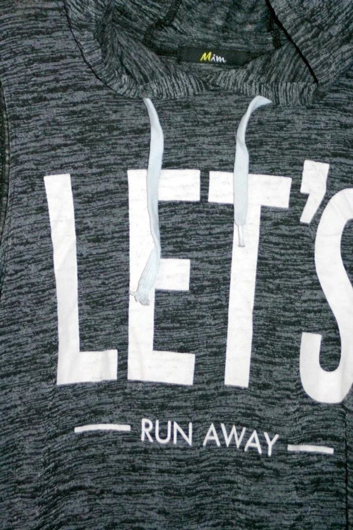 Tee-shirt à capuche sans manche gris chiné de chez Mim, taille M, imprimé un peu passé, 70% polyester / 30% viscose, 150g