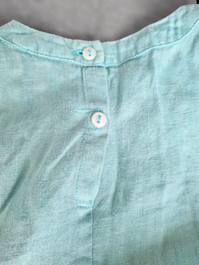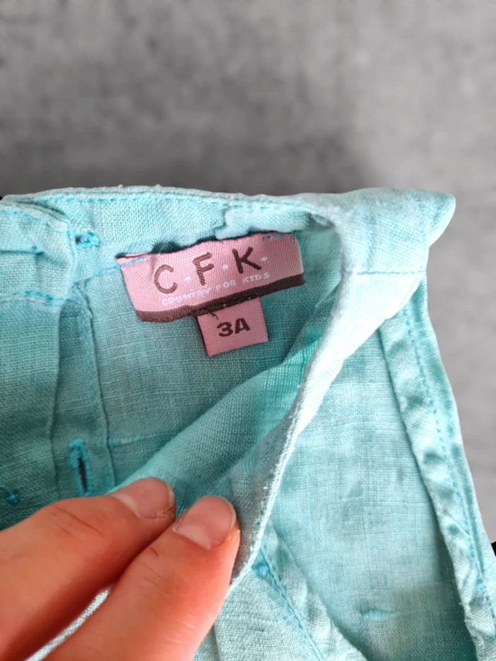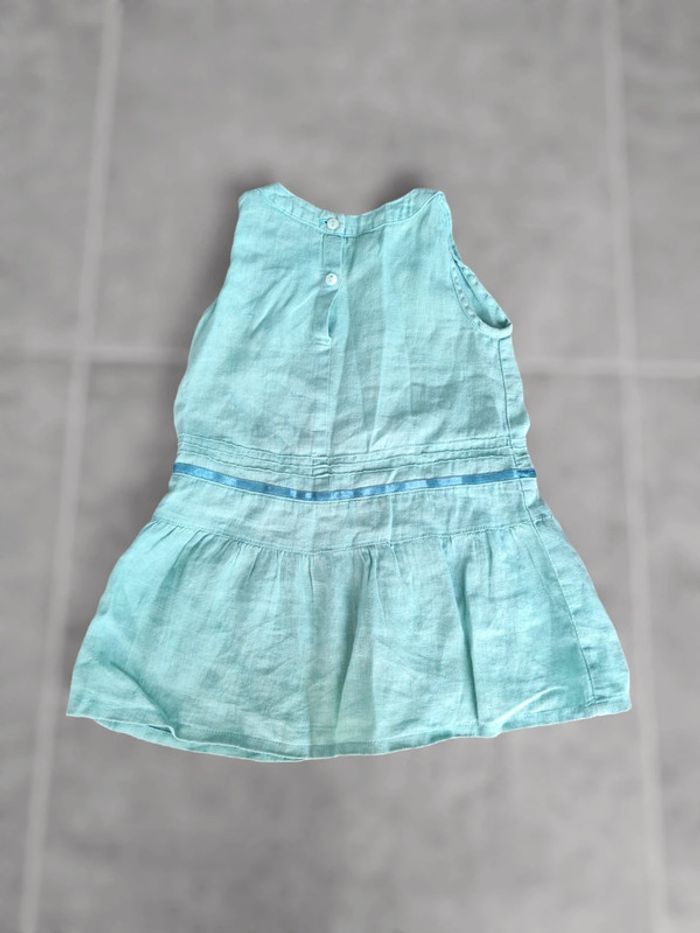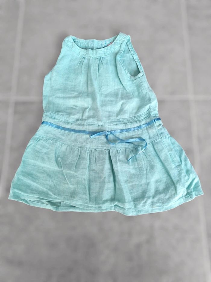 Robe courte 3 ans marque CFK. Vert menthe en tissu leger. Assez courte donc peut-être utilisée comme tunique sur un petit legging. Boutons dans dos. Excellent état.