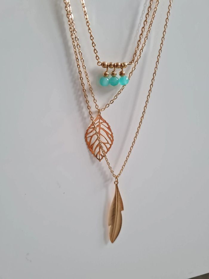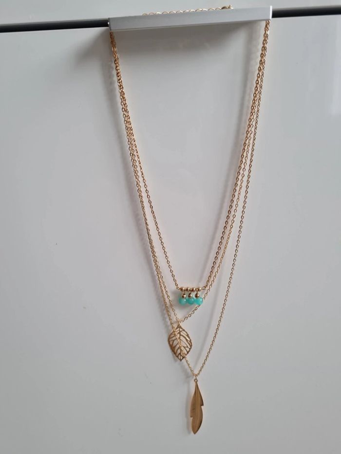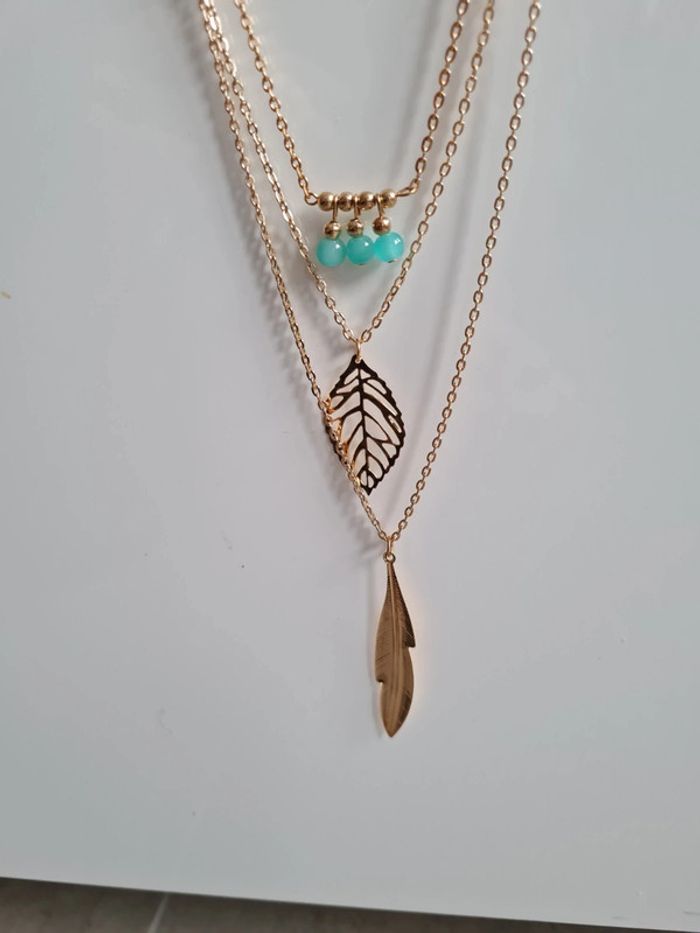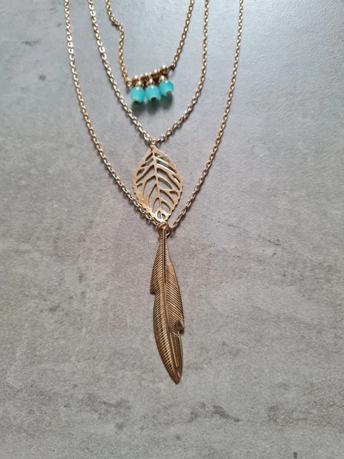 Sautoir en métal doré avec 3 fines chaînes et pendentifs fixes : une plume, une feuille ajourée et 3 perles couleur jade. Longueur 40cm (à confirmer). Neuf, jamais porté. Possibilité d'envoi en lettre suivie pour 1,90€ me contacter avant achat. Tous mes articles sont lavés avant la vente. J'ai beaucoup d'articles donc n'hésitez pas à utiliser les filtres sur mon dressing pour trouver votre bonheur, faire des lots et profiter de réductions ! 😊 - 10% dès 3 articles 👗👚🩱 - 20% dès 5 articles 👡👙🧥👖👢