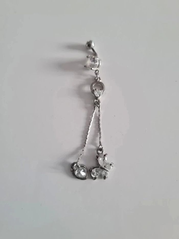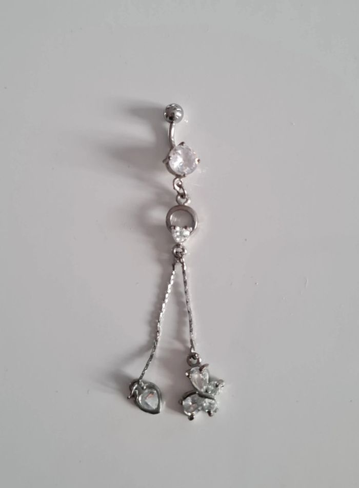 Piercing nombril en acier chirurgical je pense. Pierre blanche avec 2 pendentifs, cœur et papillon avec pierre. Longueur tige: 8 MM. Neuf, jamais porté. Possibilité d'envoi en lettre suivie pour 1,90€ me contacter avant achat. Tous mes articles sont lavés avant la vente. J'ai beaucoup d'articles donc n'hésitez pas à utiliser les filtres sur mon dressing pour trouver votre bonheur, faire des lots et profiter de réductions ! 😊 - 10% dès 3 articles 👗👚🩱 - 20% dès 5 articles 👡👙🧥👖👢